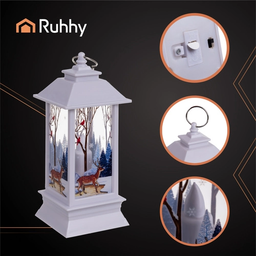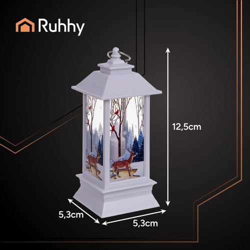 Този стилен декоративен фенер в бял цвят със зимни и коледни мотиви внася в интериора топла, уютна светлина. Интегрираното LED осветление с ефект на свещ създава приятна атмосфера без риск от открит пламък – идеален избор за дома и търговски пространства.