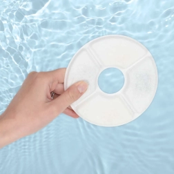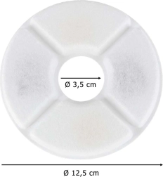 Филтрите са с диаметър 12,5 cm и централен отвор 3,5 cm, така че пасват лесно на повечето кръгли фонтани с централен стълб. Инсталацията е бърза и без инструменти – просто поставете, изплакнете и използвайте.