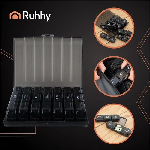 Практичният седмичен органайзер за лекарства RUHHY помага да поддържате ред и редовност на дозиране през цялата седмица. Съдържа 7 подвижни кутии с ясно обозначение на дните и разделяне на сутрин, обяд и вечер. Благодарение на здравия калъф е компактен, сигурен и идеален за дома, работата и пътувания.