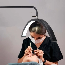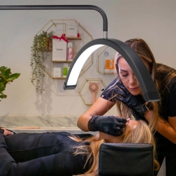Дъговидната LED глава (64 cm) равномерно осветява работната площ без резки сенки – идеална за детайлна работа по мигли, вежди и нокти.