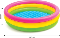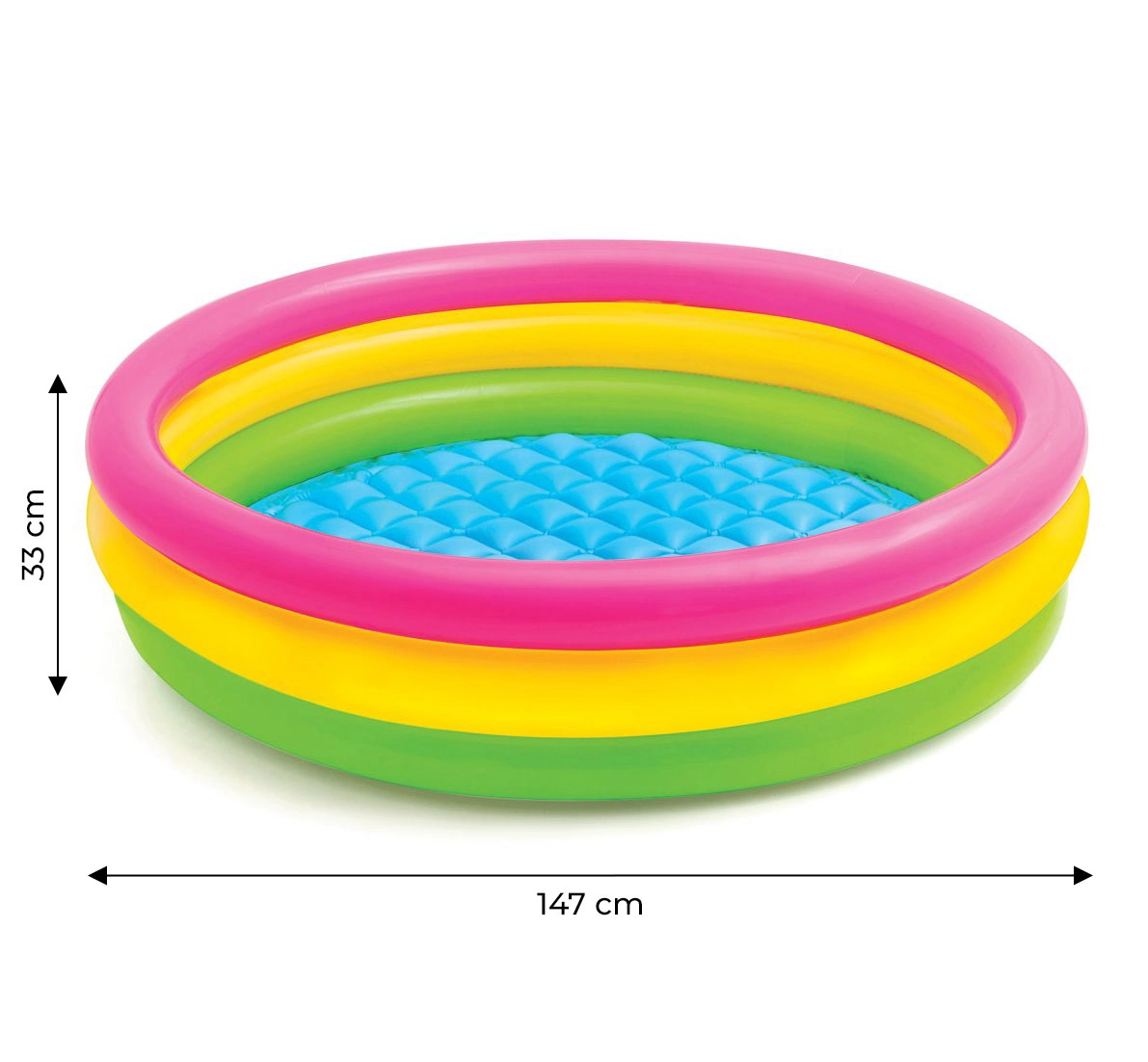 Надуваем детски басейн с диаметър 147 см и височина 33 см е идеалният избор за горещите летни дни. Интензивните цветове розово, жълто и зелено впечатляват всяко дете и превръщат всяко пространство в малко водно кралство.