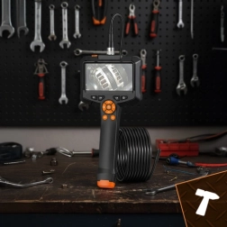 Твърдият кабел запазва посоката в тесни или пречупени участъци. Осветлението от 8 LED с настройки 0/60/80/100 % гарантира видимост дори в пълен мрак. Покритие IP67 за работа в тежка среда.