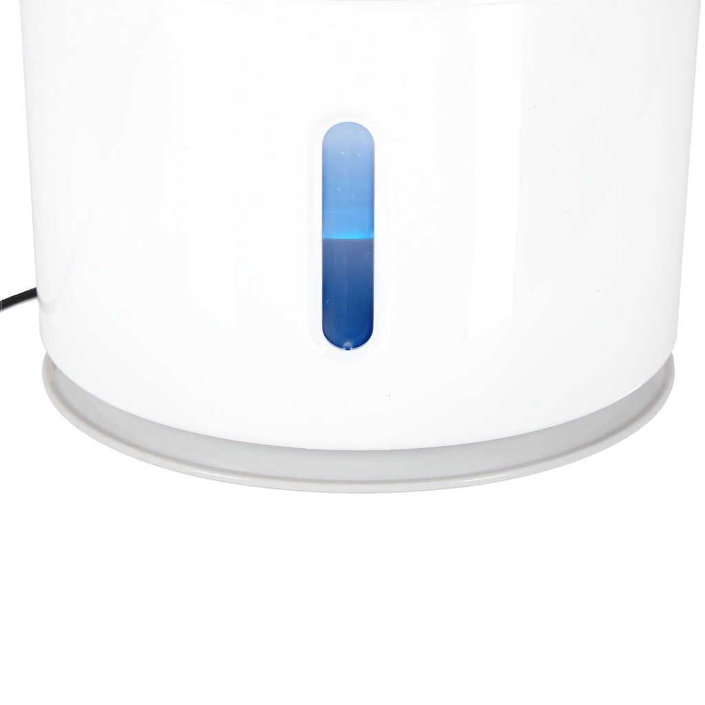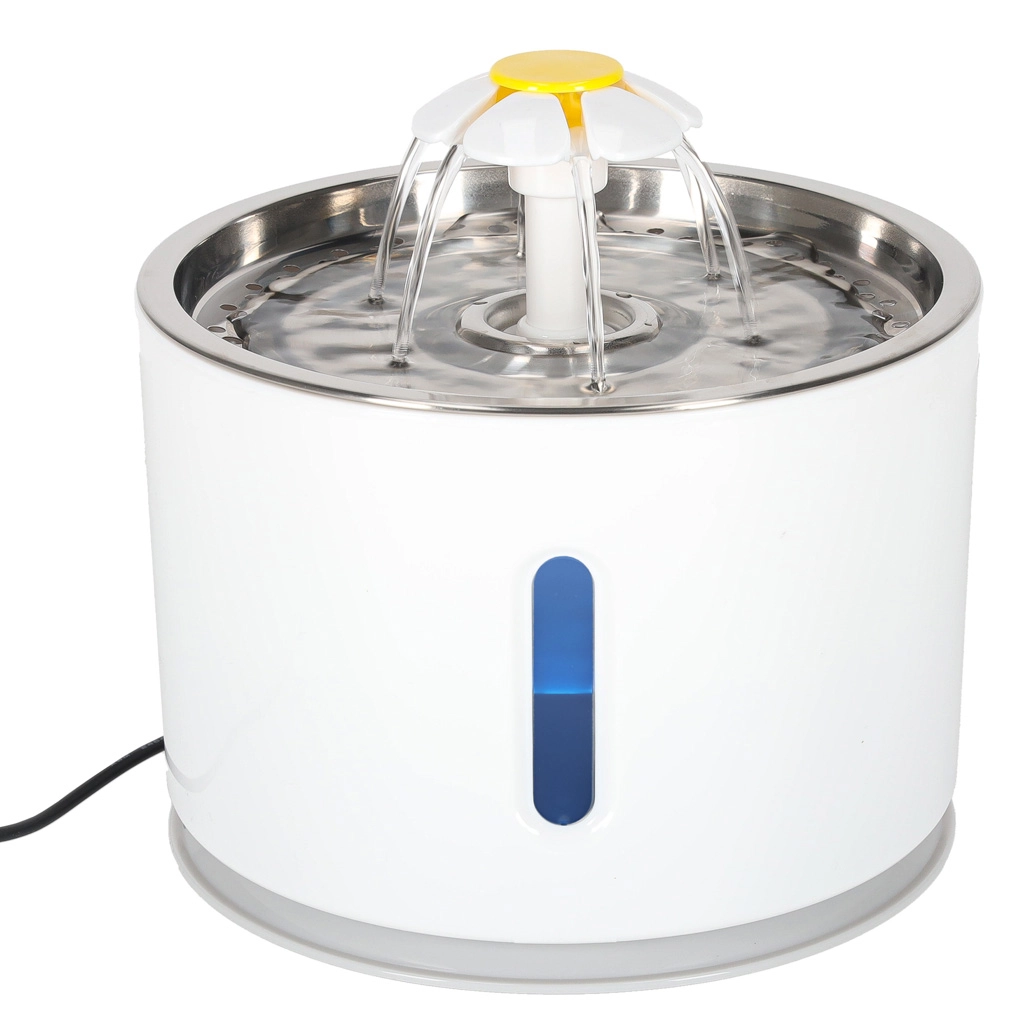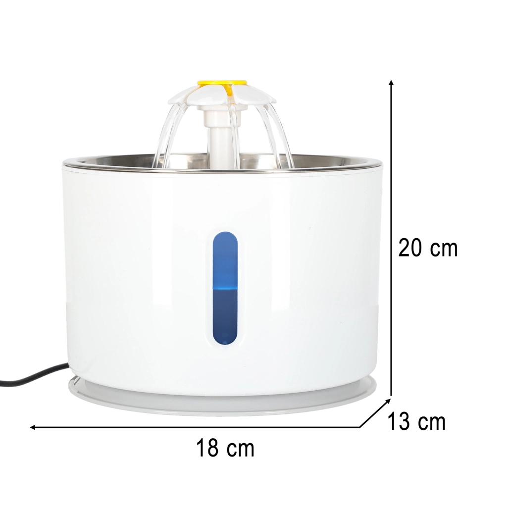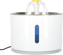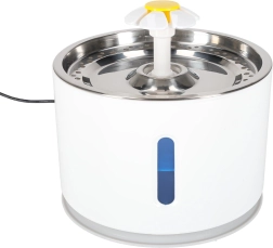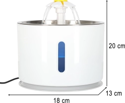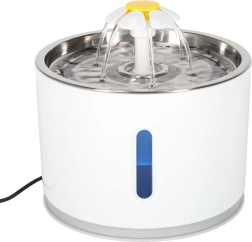 Осигурете на домашния си любимец постоянен достъп до прясна вода. Този тих фонтан с обем 2,4 l от пластмаса и неръждаема стомана поддържа водата в движение, което повишава нейната привлекателност и свежест. Благодарение на прозореца и LED подсветката на нивото имате ясен поглед върху състоянието на водата, сменяемият филтър с активен въглен улавя замърсявания и косми, а USB захранването 5 V улеснява поставянето навсякъде в дома.