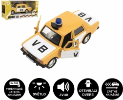 Стилен модел на полицейска кола VB Lada, който ще зарадва всеки малък полицай. Предлага обратно движение, светлинни и звукови ефекти, отварящи се предни врати и компактна дължина 12 см. Батерии 3× AG3 са включени в комплекта.