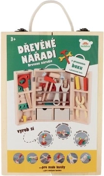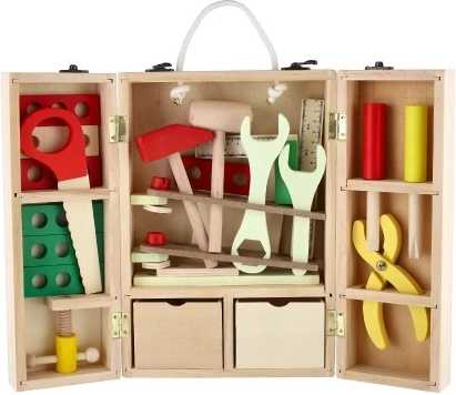 Открийте качествения дървен куфар с инструменти, който позволява на децата безопасно да имитират света на възрастните. В комплекта ще намерят отвертки, чукче, ключове, гайки, винтове, ъгломер, линийка, трион и други аксесоари. Всичко е подредено в здрав куфар с дръжка за лесно пренасяне.