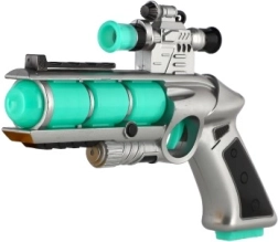 Дизайнът на пистолета напомня оръжия от бъдещето благодарение на стилните тюркоазени и сиви нюанси.