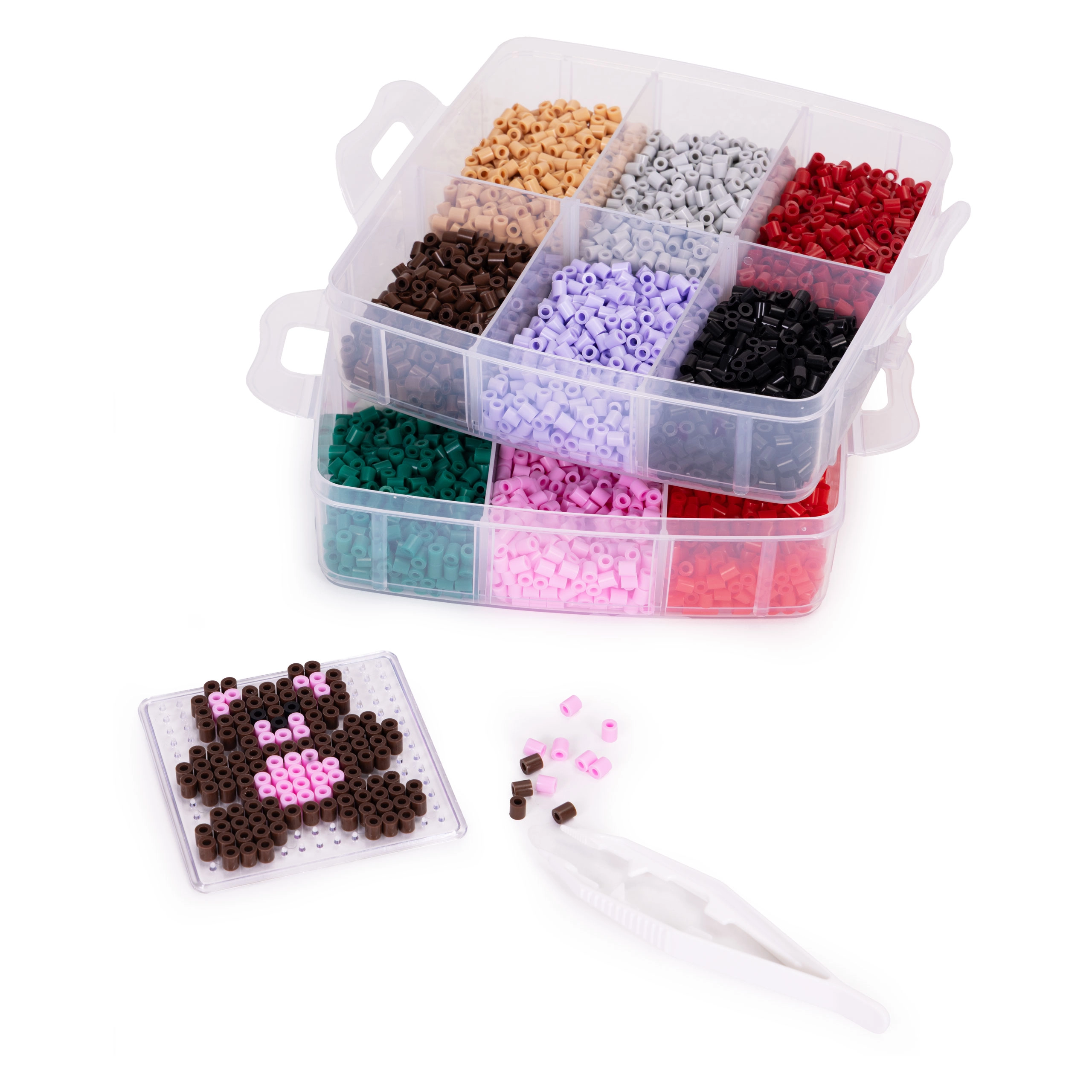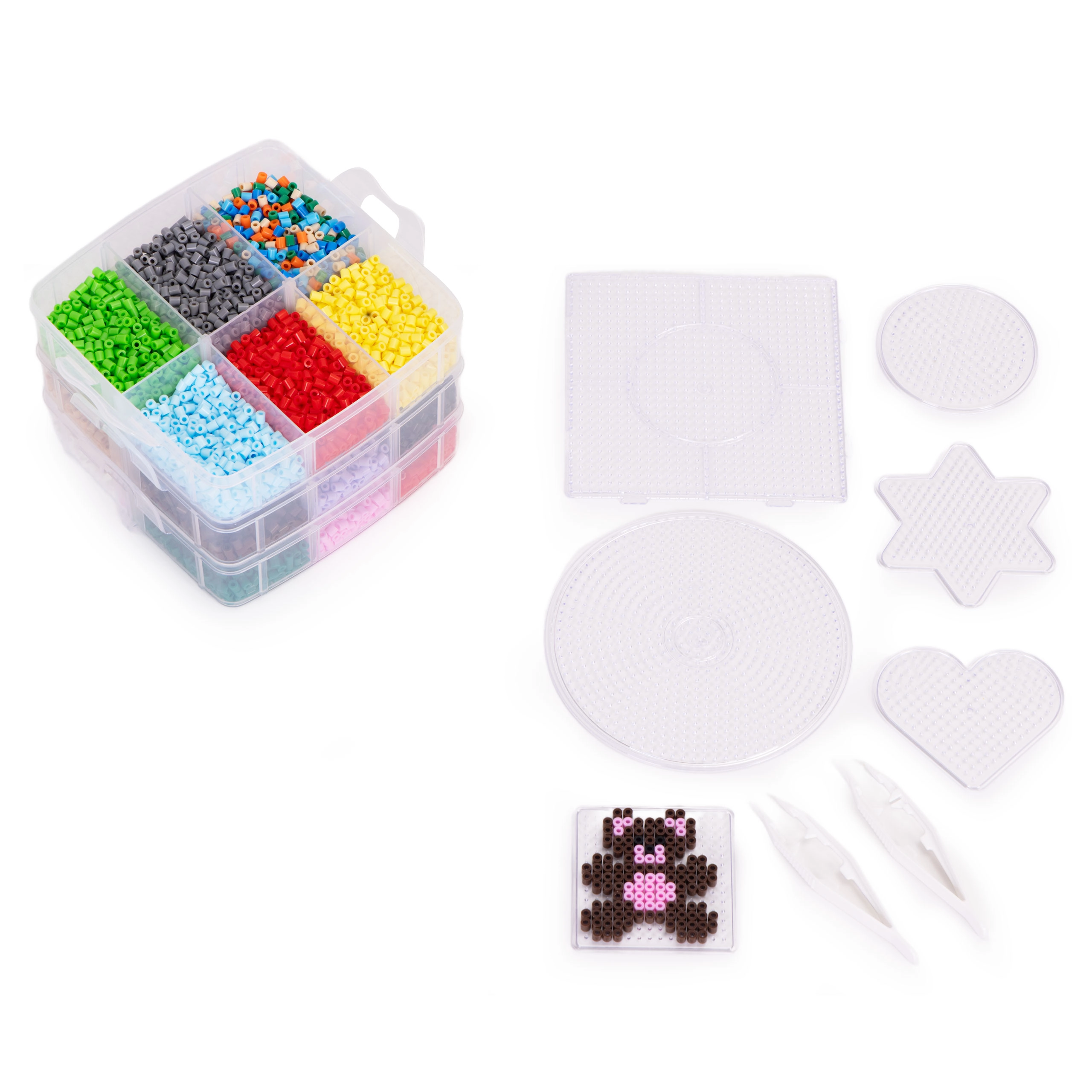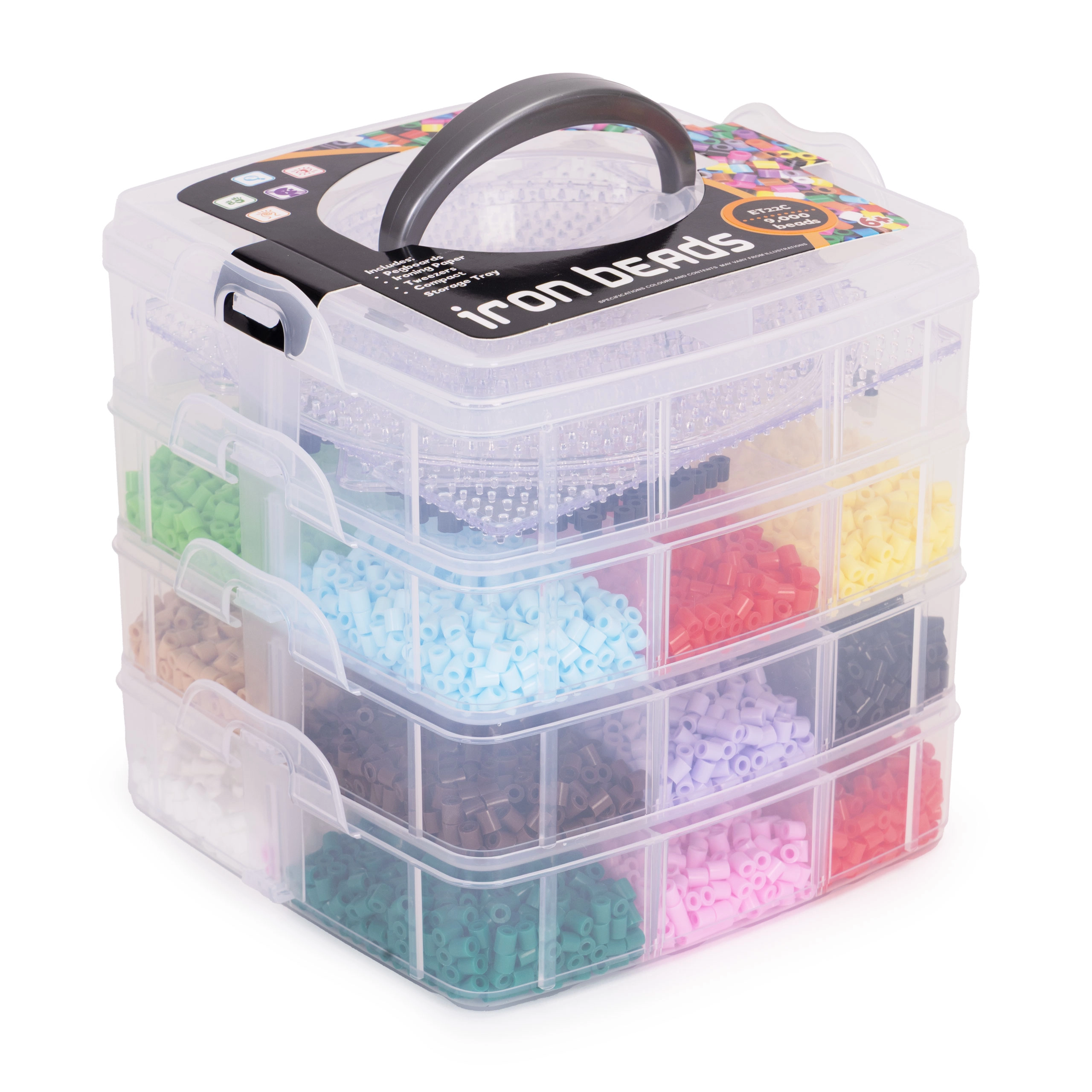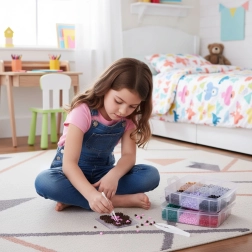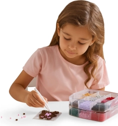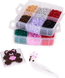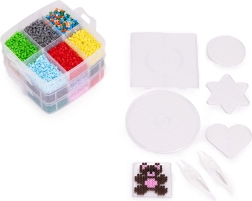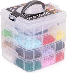 Съдържание на опаковката: до 9000 мъниста в много цветове, 6 подложки (кръг, квадрат, звезда, сърце и др.), 2 пинсети, хартии за термозалепване, дизайнерски шаблони и просторен органайзер с отделения. Благодарение на стекаемата кутия всичко е подредено и готово за ново творчество у дома и в движение.