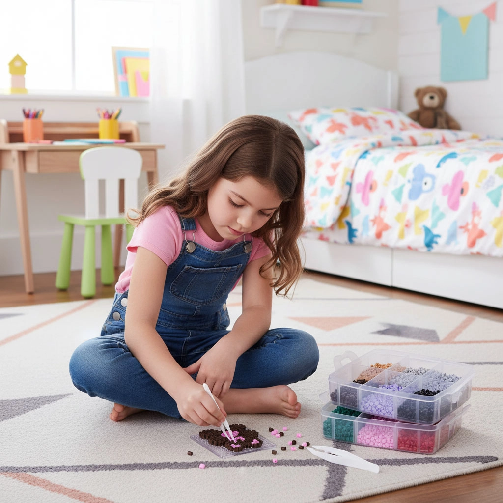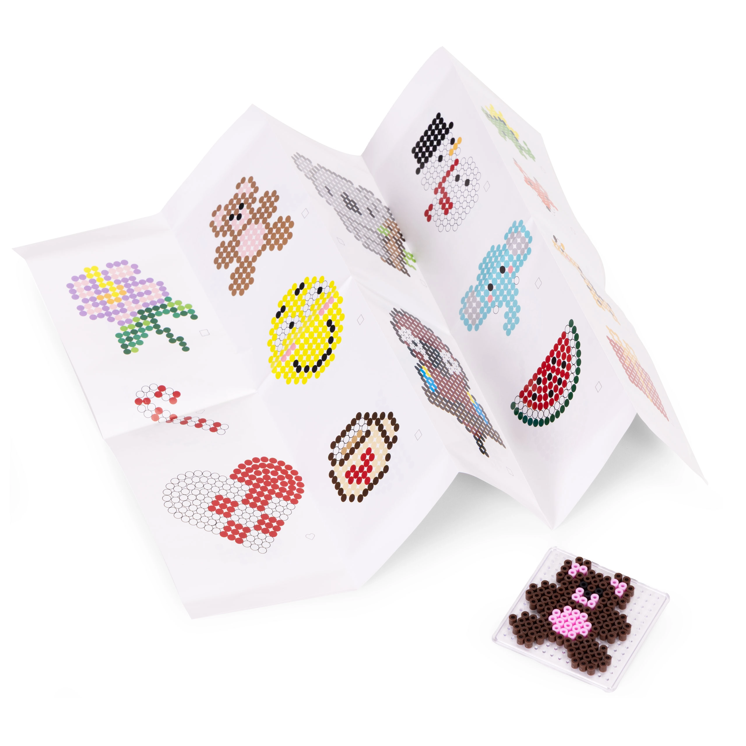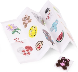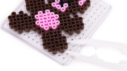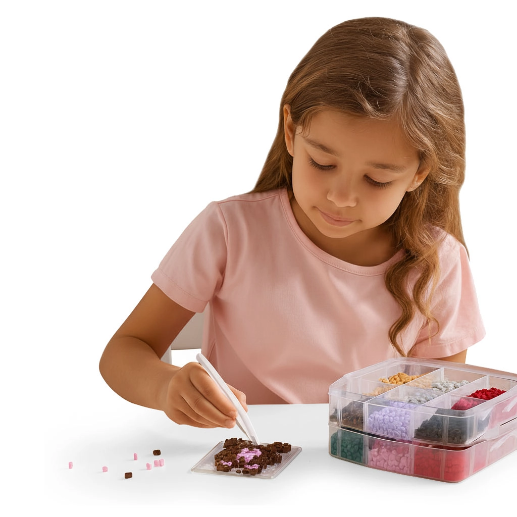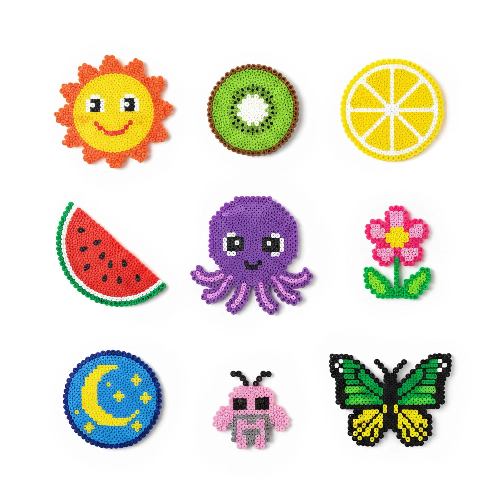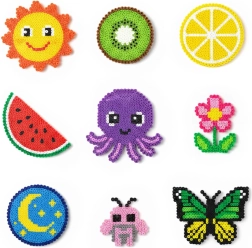 Голямото количество мъниста в широка палитра от цветове позволява на децата да създават животни, символи, украшения и „пиксел арт“ картинки – от прости мотиви до сложни шарки.