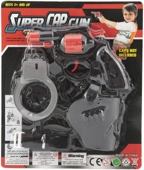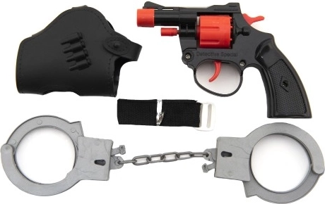 Този детски пистолет на капси носи много безопасно забавление и стимулира въображението при игри на полицаи. В комплектa са включени удобен кобур за колан и пластмасови белезници, които правят игровото изживяване още по-автентично. Благодарение на компактната дължина 13 см пистолетът се държи лесно и от по-малки деца.