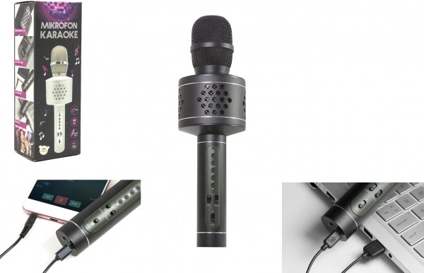 караоке микрофон, USB–Micro USB кабел за зареждане, аудио кабел, инструкция за употреба