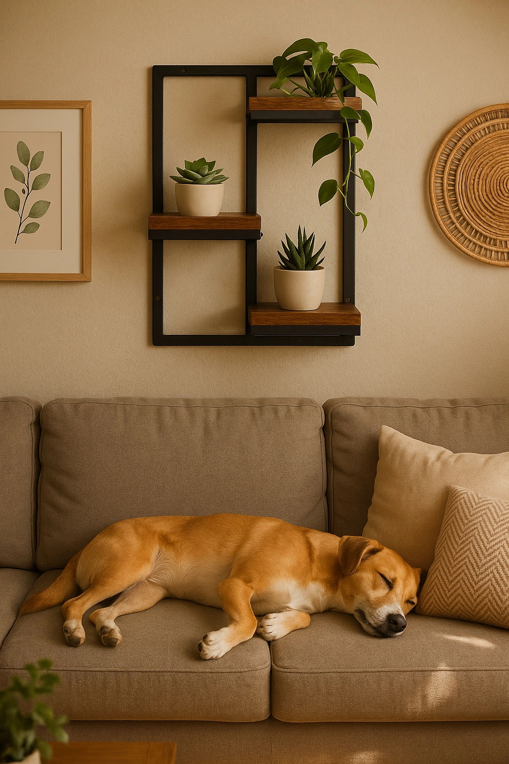 Трите рафта, разположени на шахматен принцип, осигуряват достатъчно място за билки, сукуленти и декорации, без да заемат подова площ.