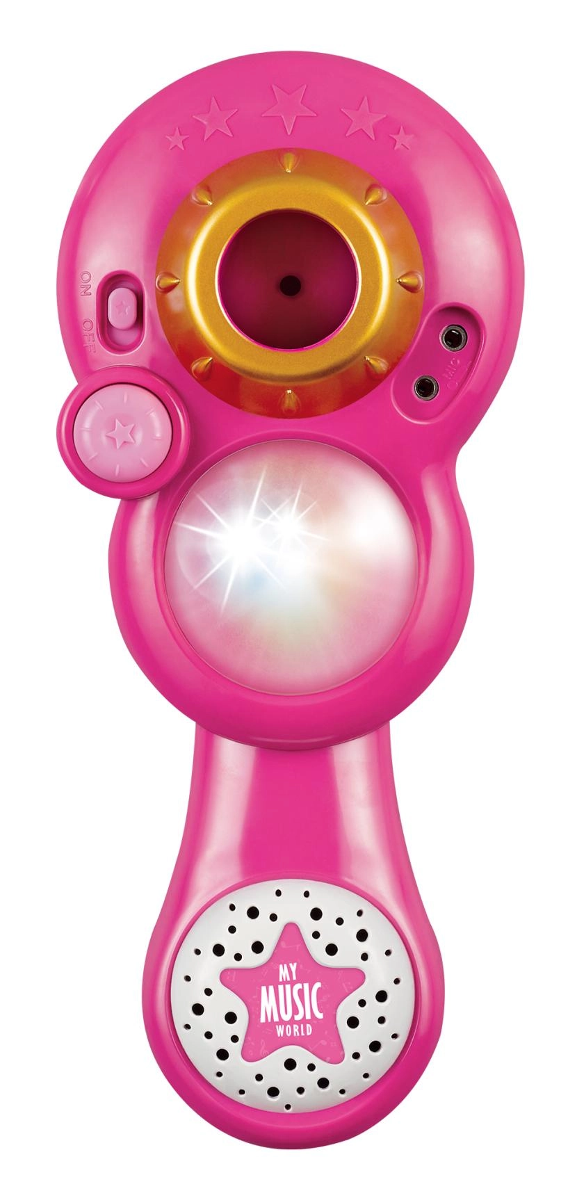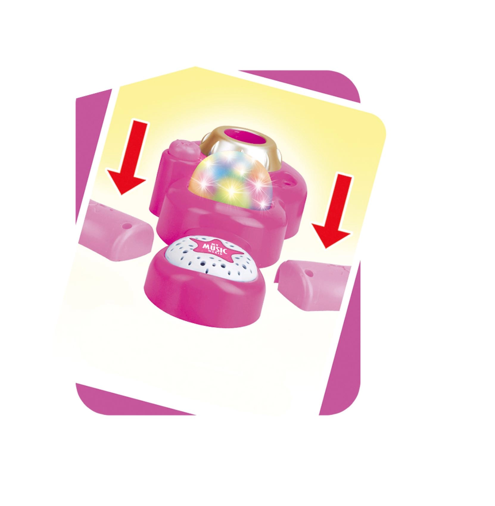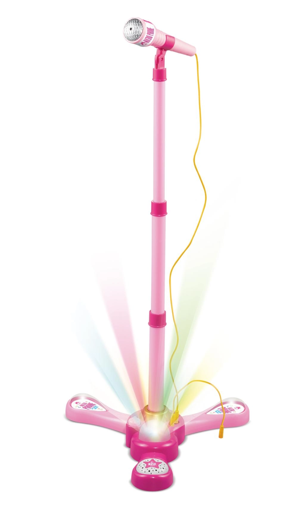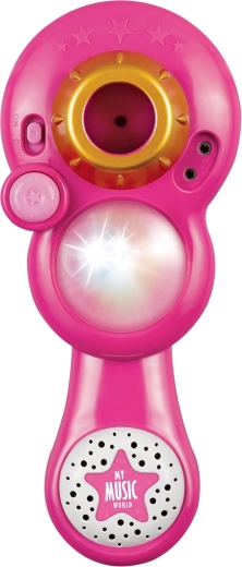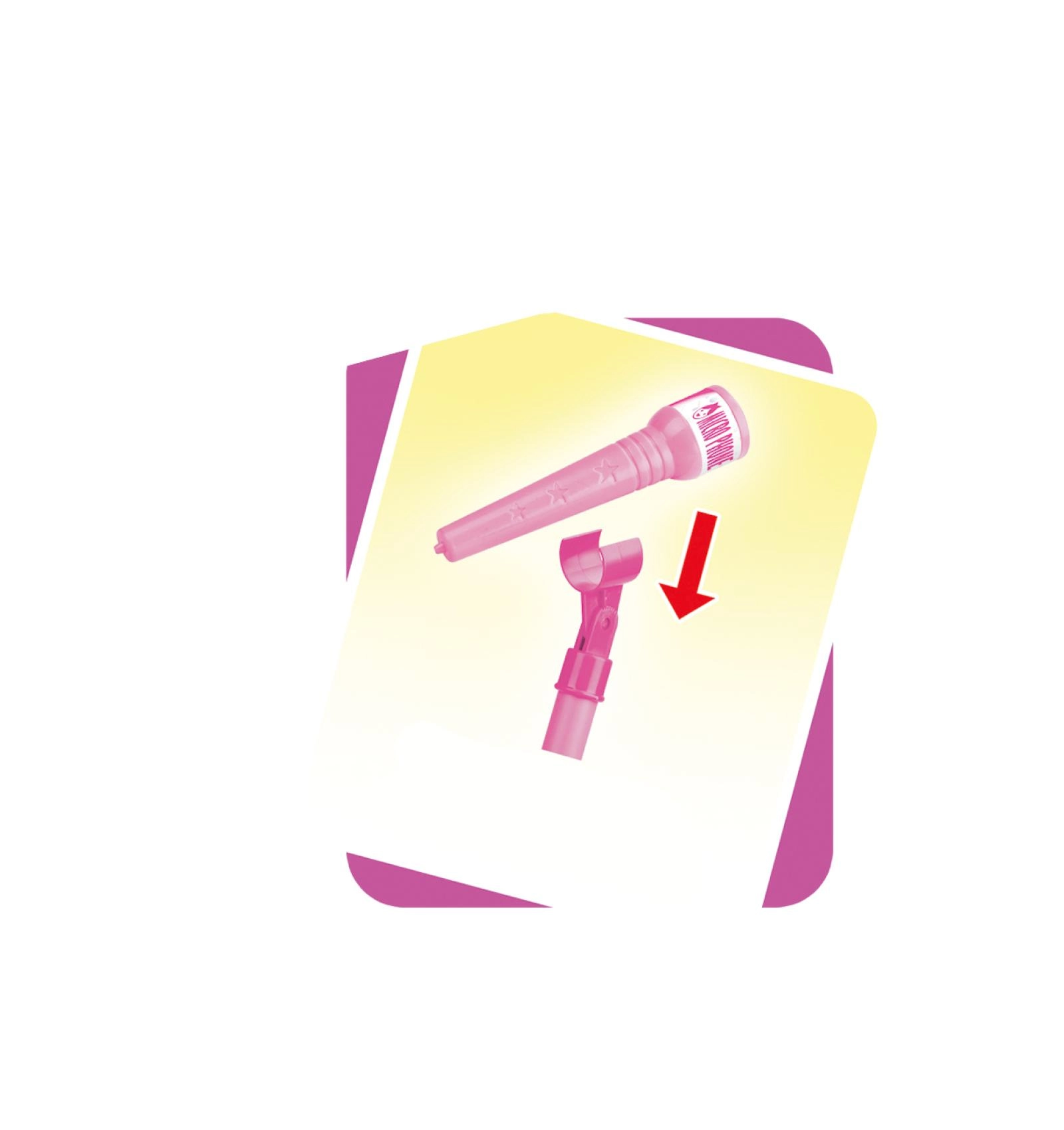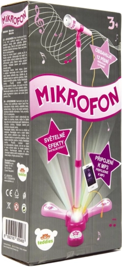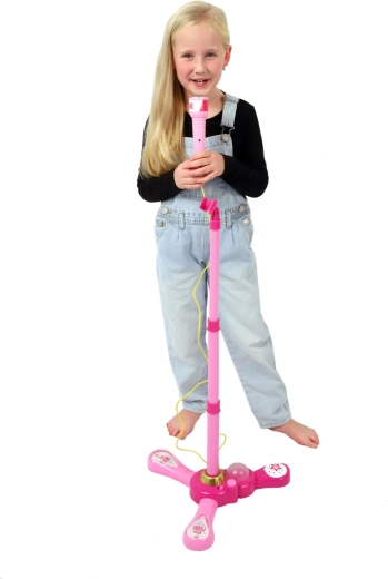 Организирайте у дома незабравимо караоке шоу. Този розов микрофон със стабилна триподна стойка има атрактивни светлинни ефекти и възпроизвежда 12 предварително записани песни. Лесно свързвате MP3 плеър или мобилен телефон и пускате любимите хитове.