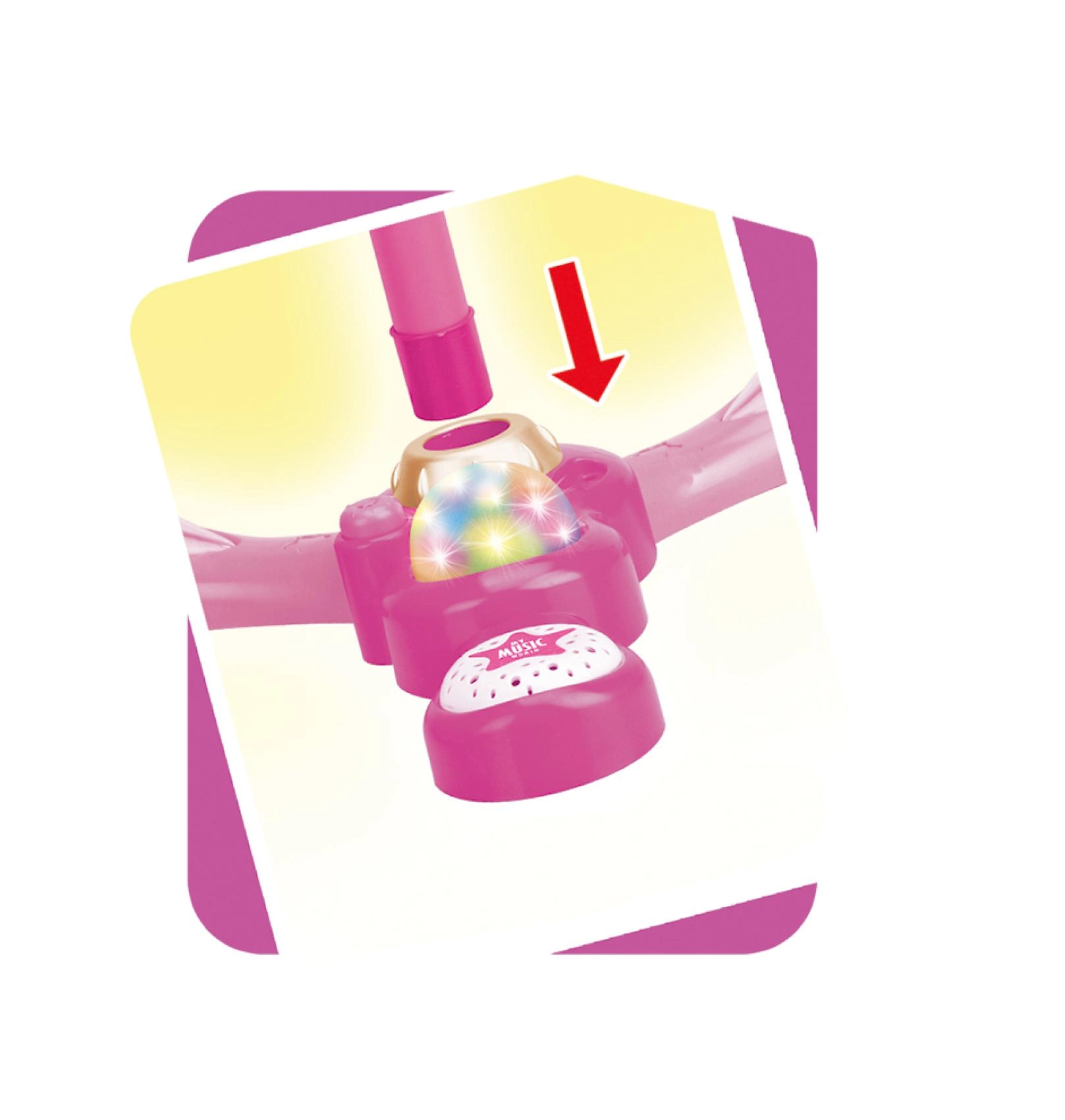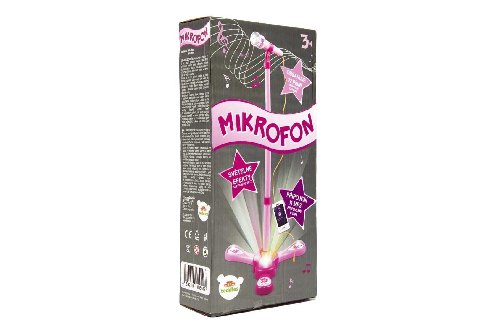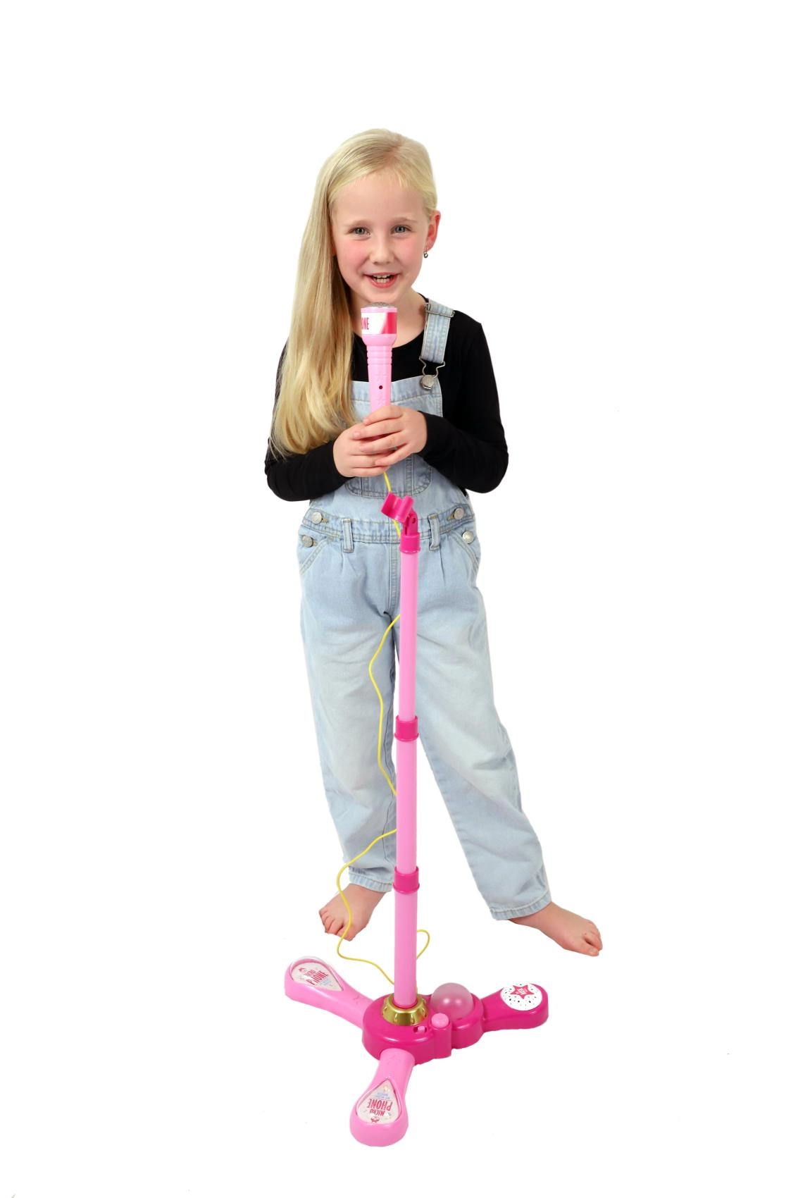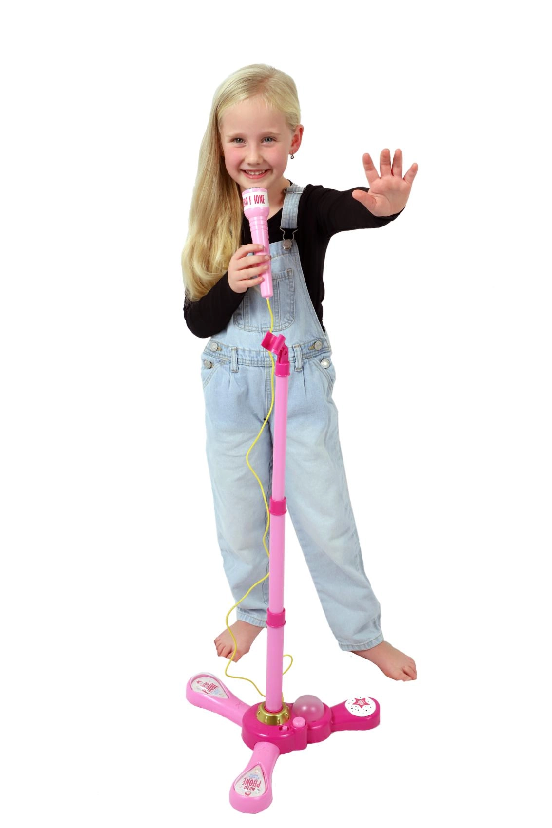 Организирайте у дома незабравимо караоке шоу. Този розов микрофон със стабилна триподна стойка има атрактивни светлинни ефекти и възпроизвежда 12 предварително записани песни. Лесно свързвате MP3 плеър или мобилен телефон и пускате любимите хитове.