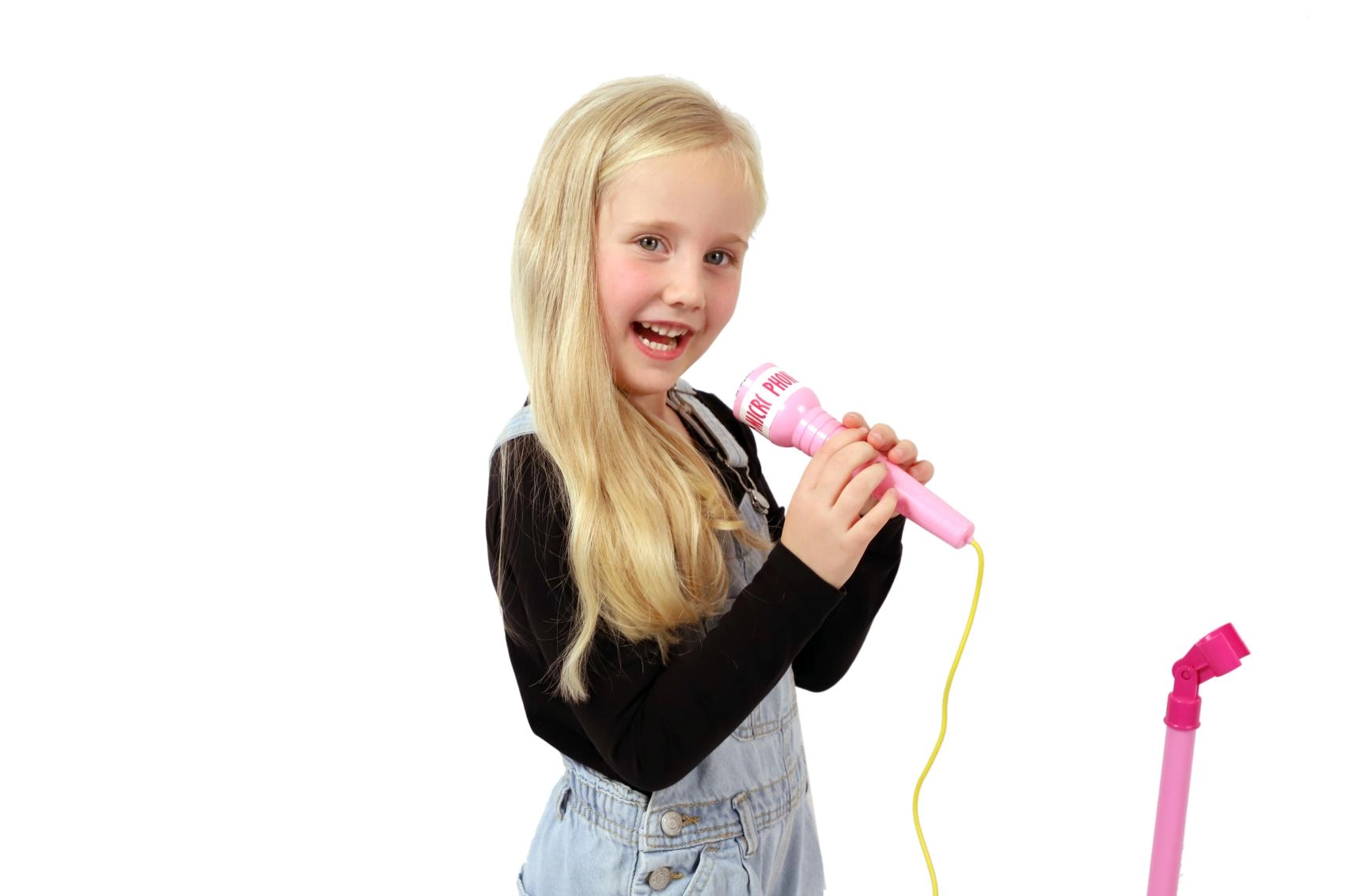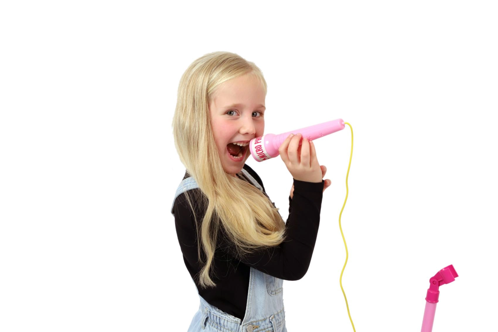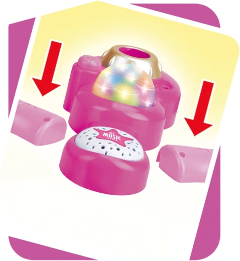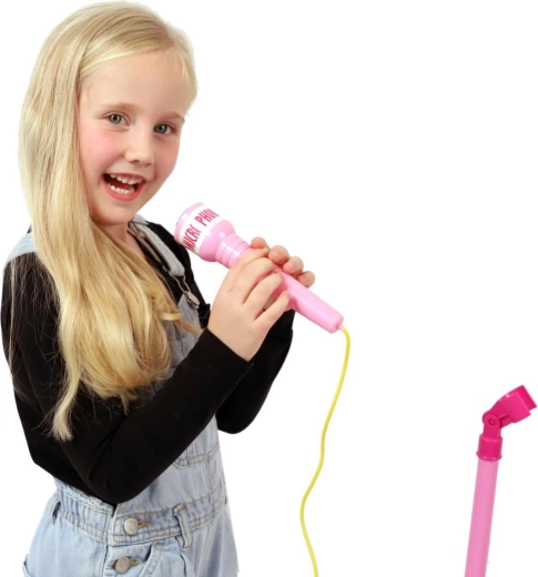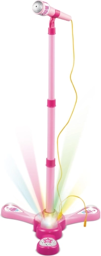 Розовият караоке микрофон на стойка превръща всяка детска стая в сцена. Предлага 12 вградени песни, цветни светлинни ефекти и възможност за свързване на MP3 или телефон. Благодарение на регулируема височина 40–80 см „расте“ заедно с детето и е идеален за малки певци от 3 години.