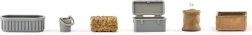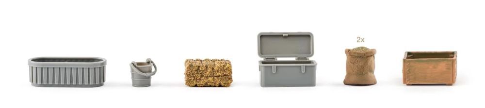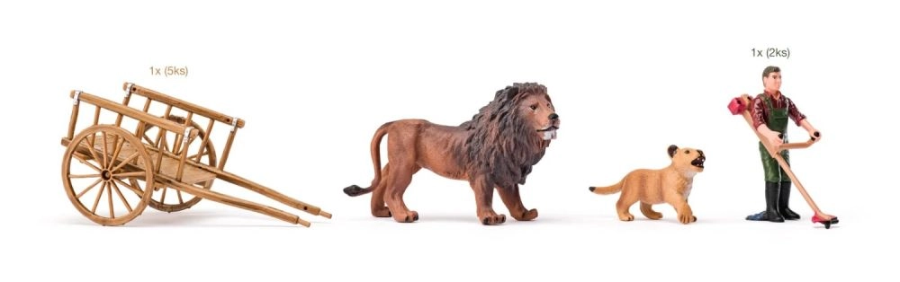- Повдигната хижа с парапет и стълба, ограждения, количка, мини инструменти, фигурка човек, фигурки животни (напр. слон, малко слонче, жираф, зебра, малка зебра, лъв, крокодил, хипопотам, антилопа, брадавичесто прасе, суриката, птици и др.)