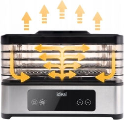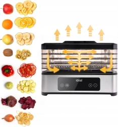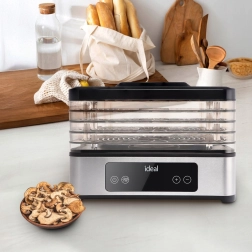 Пригответе у дома здравословни снаксове без консерванти със сушилнята за храни WEBBER IK3301. Тя предлага 5 височинно регулируеми нива (29 × 23 cm), мощност 400 W, плавно регулиране на температурата 35–70 °C и таймер 30 мин – 24 ч. Конвекционната циркулация на въздуха осигурява равномерно сушене без въртене на тавите, тихата работа е идеална и за през нощта, а прозрачното тяло позволява контрол на процеса. Интуитивният LED панел и лесната поддръжка правят този модел надежден помощник за плодове, зеленчуци, билки и месо.