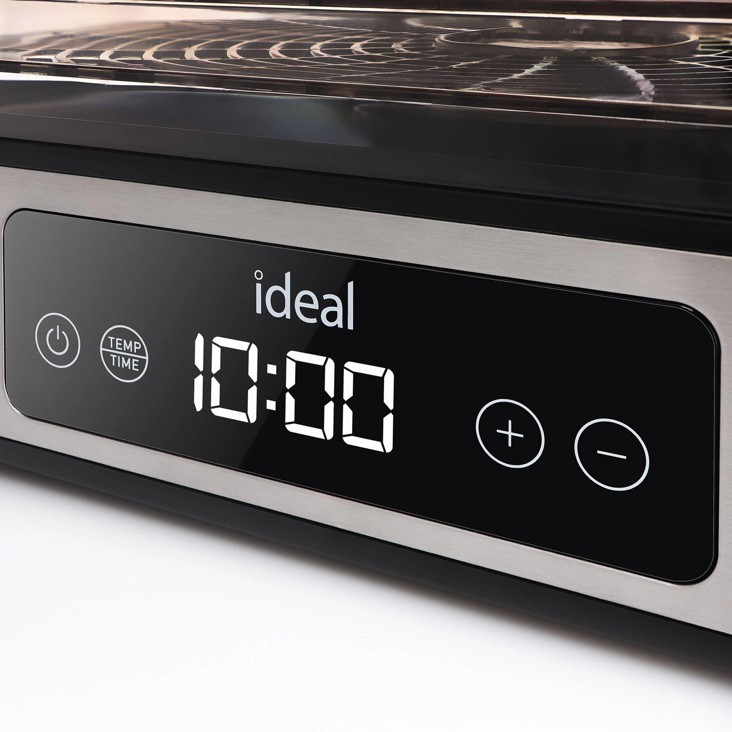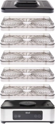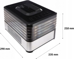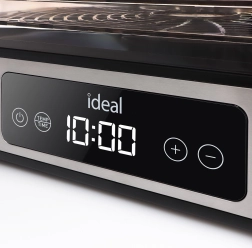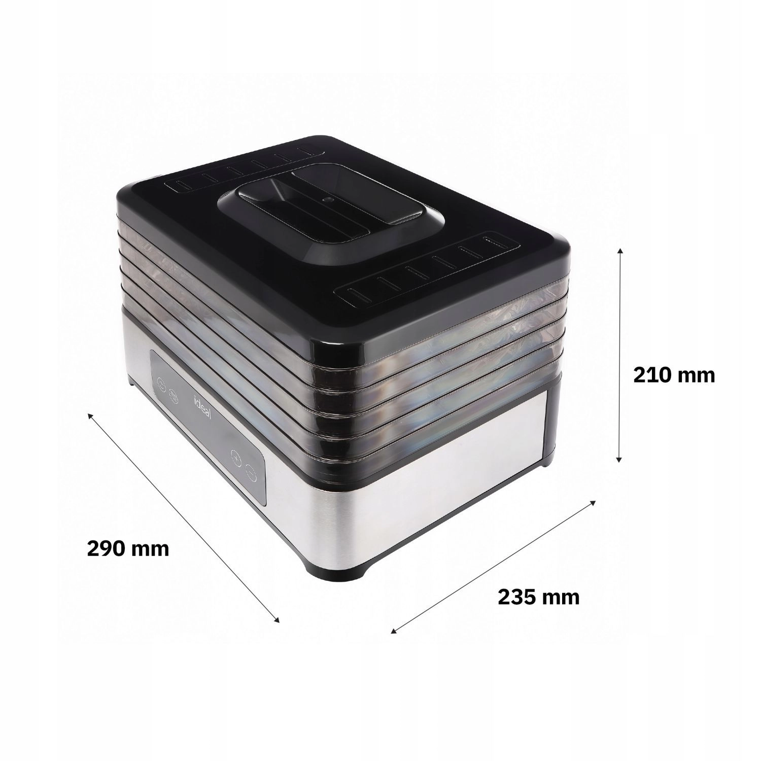 Управлението е максимално лесно чрез електронен LED панел с таймер от 30 минути до 24 часа. Тихата и енергийно ефективна работа е подходяща за нощно сушене, а прозрачната конструкция позволява да следите процеса без отваряне. Тавите имат регулируема височина за различни размери резени, а уредът се разглобява и почиства лесно.