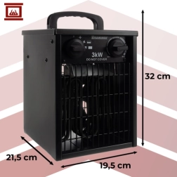 Електрическият отоплител KAMINER с мощност 3000 W е идеален за дома, офис, работилница и строителни обекти. Благодарение на силния въздушен поток 514 m³/h бързо достига желаната температура и я поддържа чрез саморесетиращ се термостат. Степента на защита IPX4 осигурява безопасна употреба и във по-влажна среда.