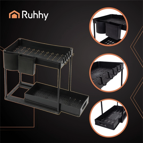 Практичният двуетажен органайзер Ruhhy максимално оползотворява пространството под мивката, в килера или в банята. Изтеглящите се рафтове позволяват удобно да достигнете до почистващи препарати, гъби или козметика без да местите други вещи. Стабилната метална рамка и качественият PP пластмаса осигуряват дълъг живот дори в среда с повишена влажност.