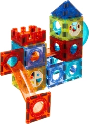 Магнитните блокчета и елементите за писти от издръжлива ABS пластмаса се свързват лесно и стабилно благодарение на силните магнити. Децата могат да строят плоски и пространствени конструкции, кули, мостове и най-вече креативни писти за топчета с тунели, завои и купички. Прозрачните цветове подпомагат възприемането на форми и цветове и приканват към откривателство.