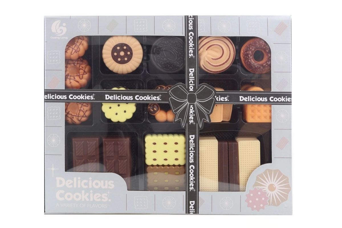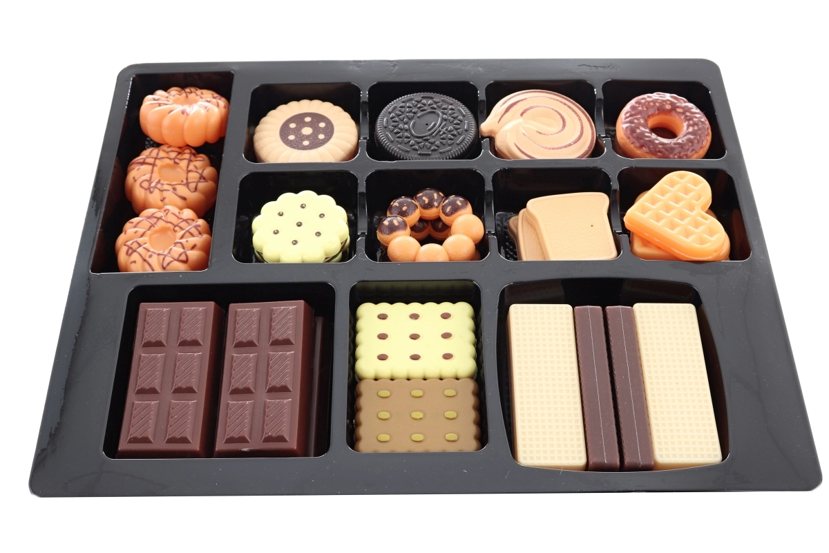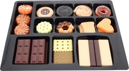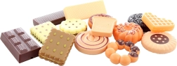Комплектът включва подбор от сладкиши – вафли, бисквити, шоколад и гофрети – идеален за игра на магазин или кухня. Практичната опаковка в подаръчна кутия го прави страхотен подарък за малки готвачи.