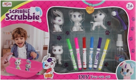 - Пълно оборудване – 4 животинки, 6 цвята, ваничка, четчица и пулверизатор