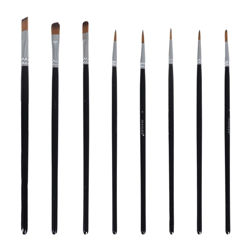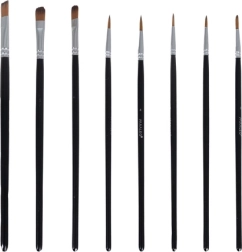 Комплект от 10 четки (плоски и кръгли) и лека пластмасова палитра с вдлъбнатини и отвор за палец за удобно смесване и детайли.