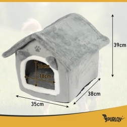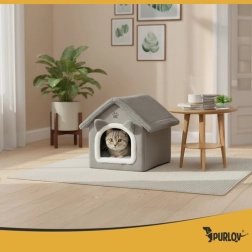 Търсите уютно убежище за своята котка? Къщичката-легло Purlov предлага мека плюшена среда, подвижна възглавница за лесно пране, сваляем покрив с цип за бързо почистване и антихлъзгащо дъно за сигурност. Елегантният сив дизайн чудесно се вписва във всеки интериор.