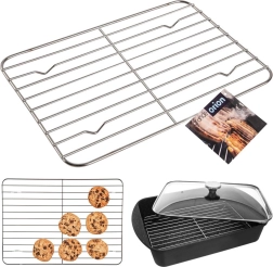 Практична скара за тава, която повдига храната над дъното, така че месото не лежи в мазнината и горещият въздух може да циркулира равномерно. Отворената решетка осигурява и бързо и равномерно охлаждане на изпечени блатове, сладки или мъфини.
