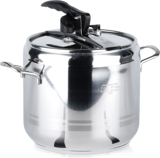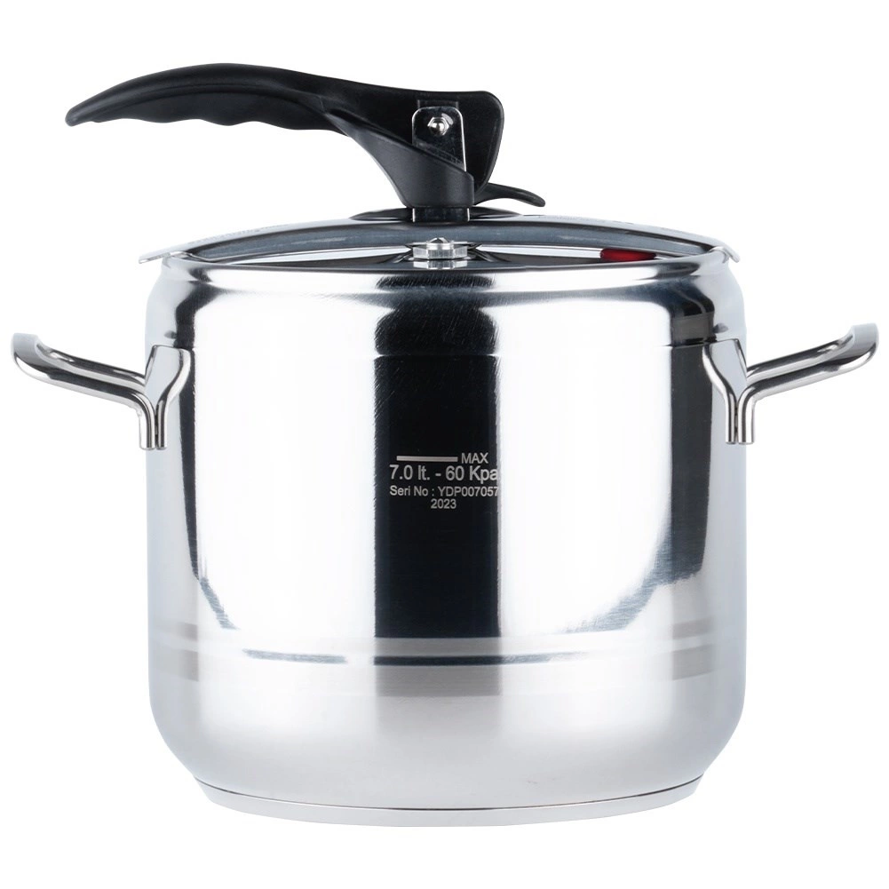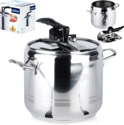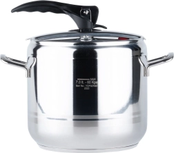 Практична тенджера под налягане с обем 7 литра от висококачествена неръждаема стомана за бързо и икономично готвене. Благодарение на готвенето под налягане съкращава времето за приготвяне, пести енергия, запазва вкуса и хранителните вещества и предлага безопасна работа с два предпазни клапана и здрава конструкция с трислойно дъно. Подходяща за всички видове котлони, включително индукция.