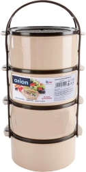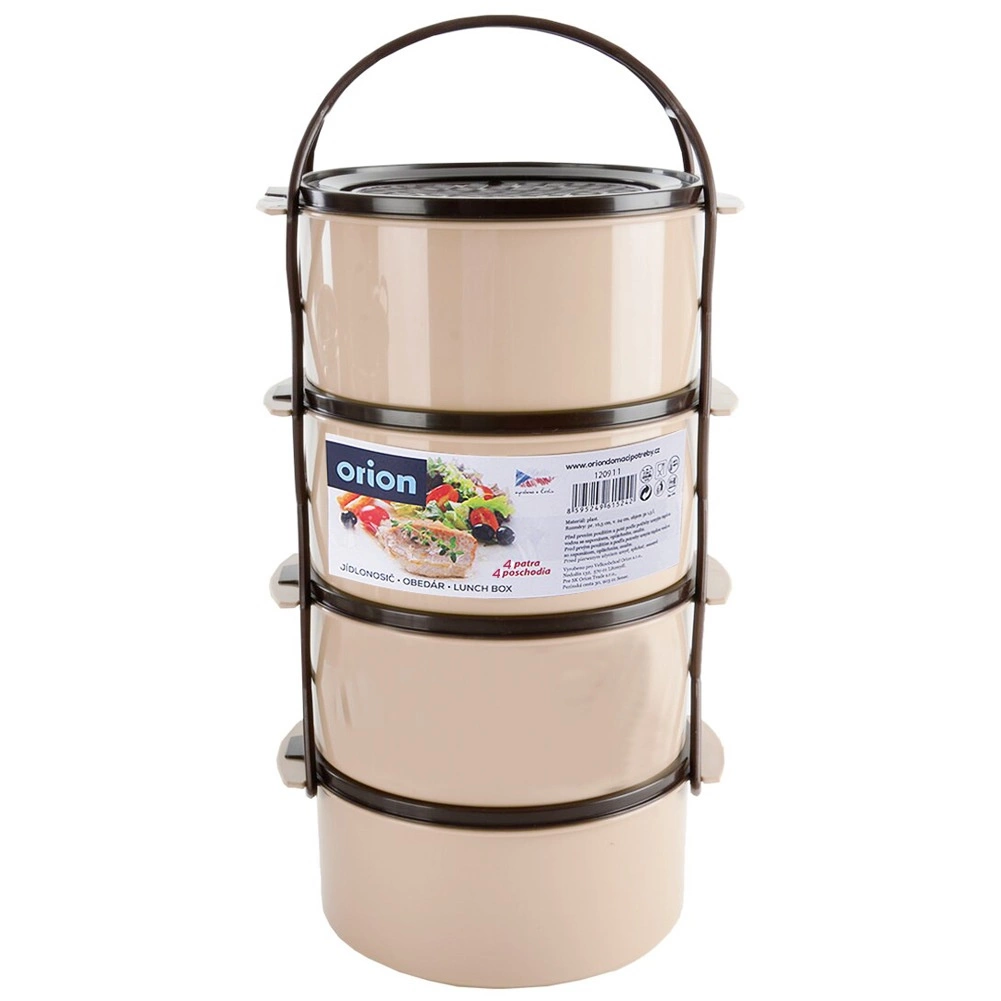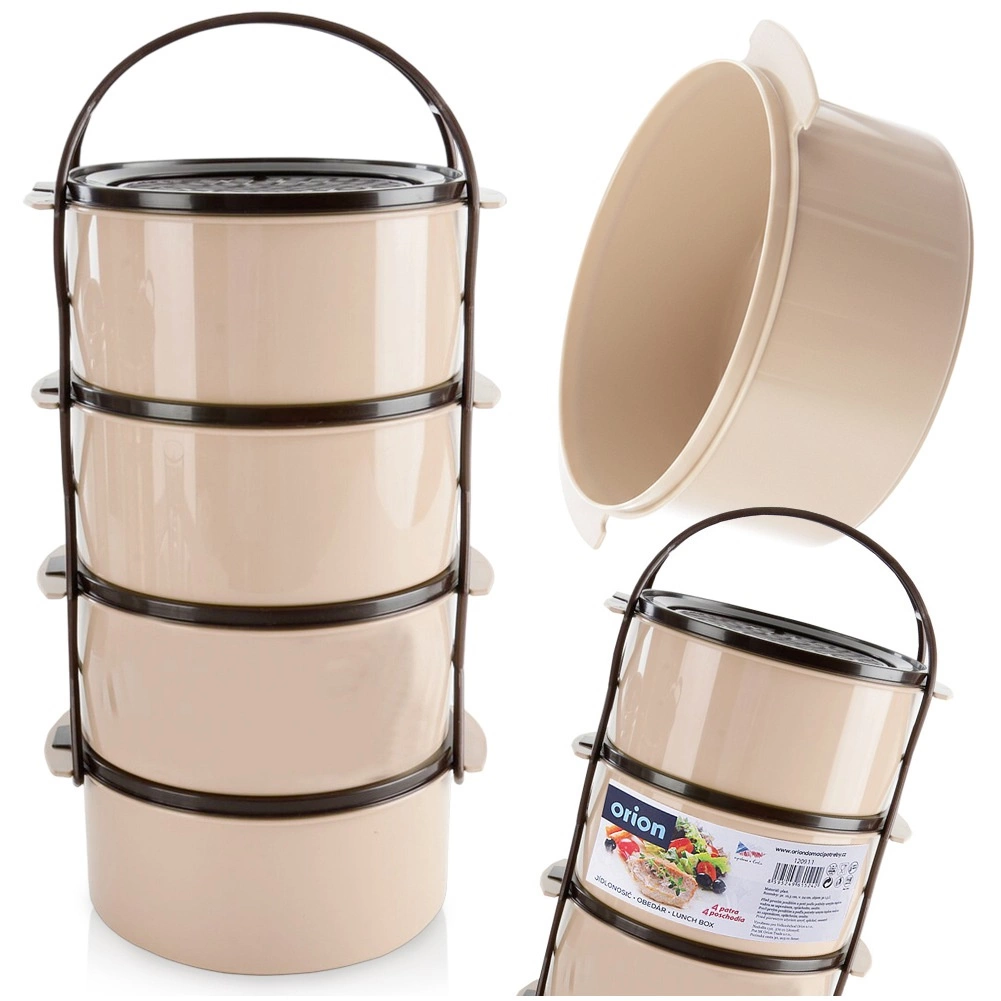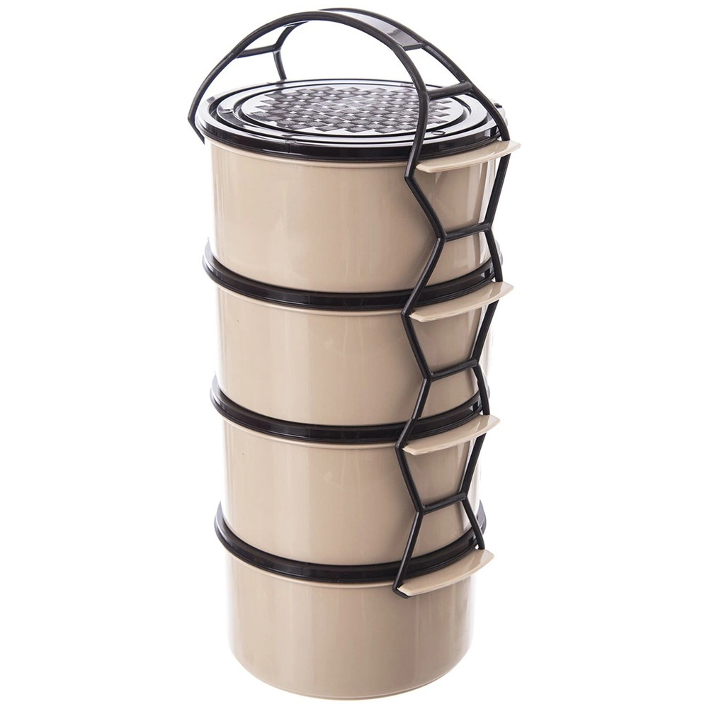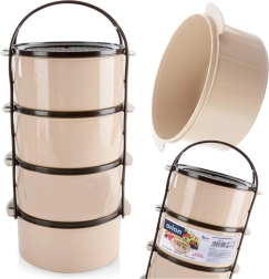 Практична четириетажна кутия за храна с обем 4×1,5 l за прегледно отделяне на ястията. Има сгъваемо/стапващо се подреждане на съдовете с капаци, здрав носещ рамков държач с дръжка и издръжлива изработка в бежово‑кафяв цвят. Подходяща за съдомиялна, хладилник, фризер и за микровълнова без капаците.