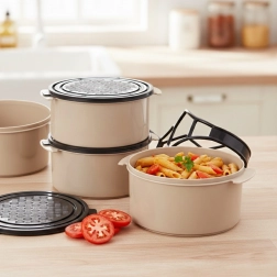 Щедър капацитет за основно ястие, гарнитури и десерт. Всеки съд има собствен капак и съхранява храната отделно и подредено.