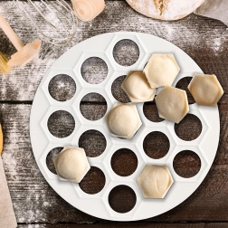 Открийте надежден помощник за домашно и професионално приготвяне на пелмени, равиоли и мини пирожки. Кръглата форма с диаметър 24 см и височина 2 см позволява да приготвите до 37 броя с размер около 3,5 × 3,5 см в една стъпка. Благодарение на здравата и лека конструкция се използва и съхранява удобно и заема минимално място.