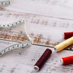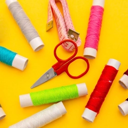 - Конци в различни цветове, игли, малки ножички, шивашки метър, копчета, напръстник, вдявач на конец, безопасни игли, игленик