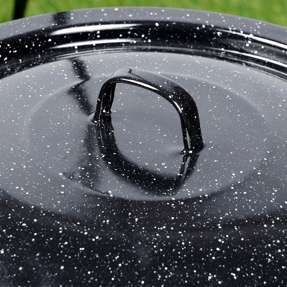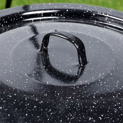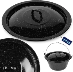 Универсален емайлиран капак с диаметър 36 см за унгарски казани с обем 9,5 л. Благодарение на висококачествения емайл е безопасен за здравето, устойчив на надраскване и корозия и помага да се запазят топлината и сочността на ястията. Здравата дръжка осигурява безопасна и удобна употреба дори при готвене над огън.