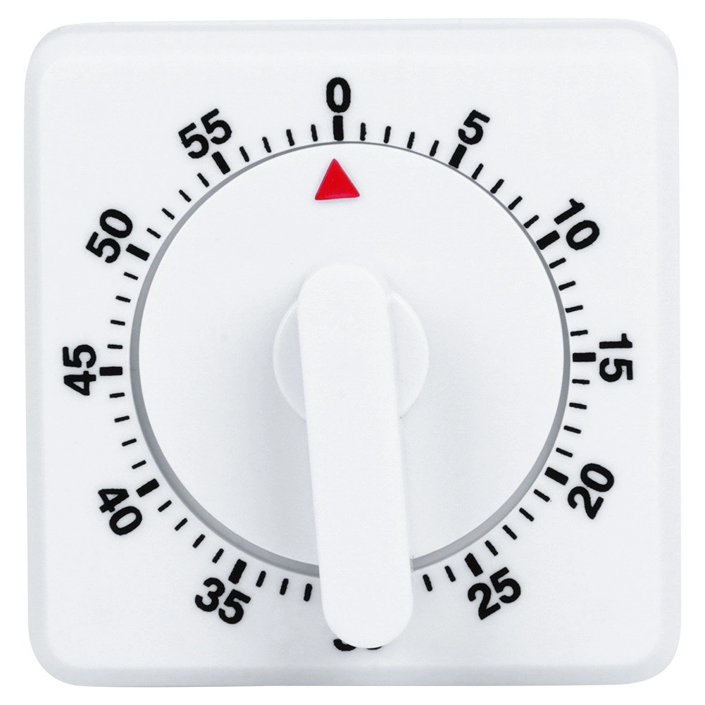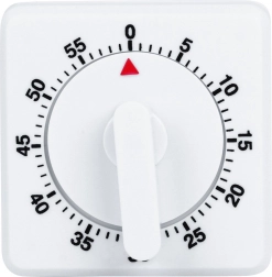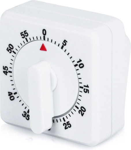 Таймерът не изисква батерии – достатъчно е първо да го завъртите до максимум и след това да върнете на желаното време. Квадратното тяло със стабилна основа гарантира надеждно поставяне на плота, а има и отвор за окачване. Качествената бяла пластмасова изработка е лека и издръжлива, лесна за почистване и подхожда на всяка кухня.