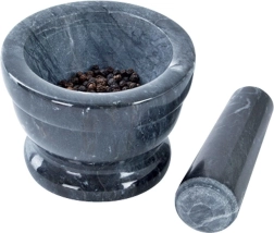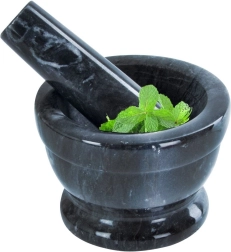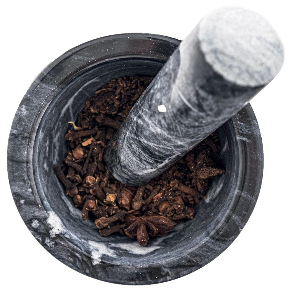 Вътрешната неполирана повърхност на купичката и долната част на чукалото осигуряват перфектно триене. Лесно развива аромата на подправки и билки и освобождава етеричните масла.