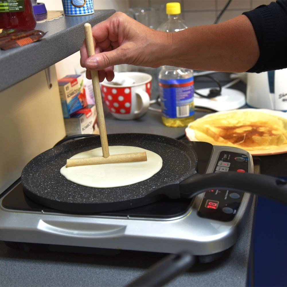 Практично дървено разстилало за палачинки позволява равномерно разнасяне на тестото в тигана и постигане на идеално тънки палачинки. Изработено е от естествена букова дървесина, леко е, издръжливо и щадящо към тефлонови, гранитни и други незалепващи повърхности. Ширина на работната част 13,5 см, обща дължина с дръжката 15 см за удобна и безопасна употреба.