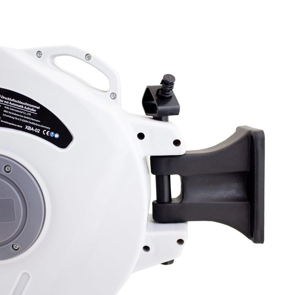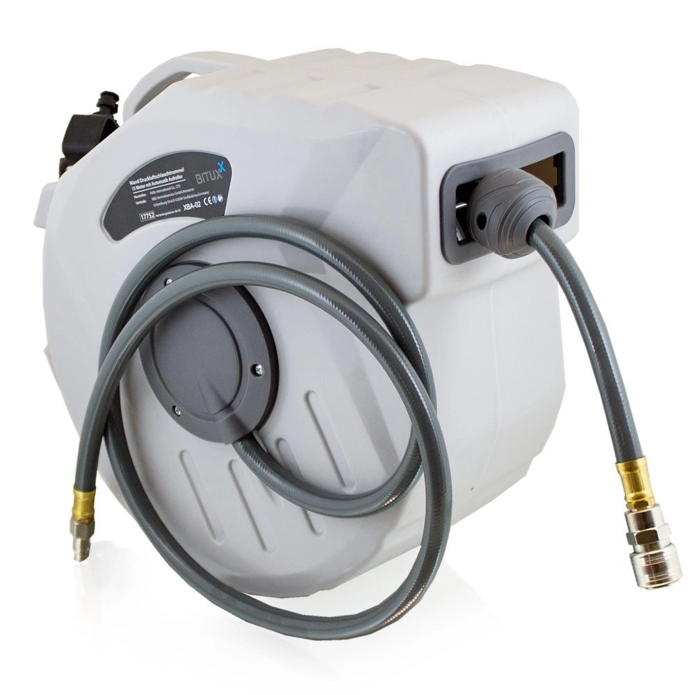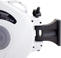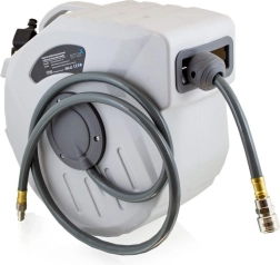 Автоматичната макара за пневматичен маркуч носи ред, безопасност и плавна работа в работилницата и гаража. Здравото пластмасово тяло защитава механизма, еластичният PVC маркуч запазва своята гъвкавост дори при по-ниски температури, а автоматичното навиване държи маркуча винаги подреден.