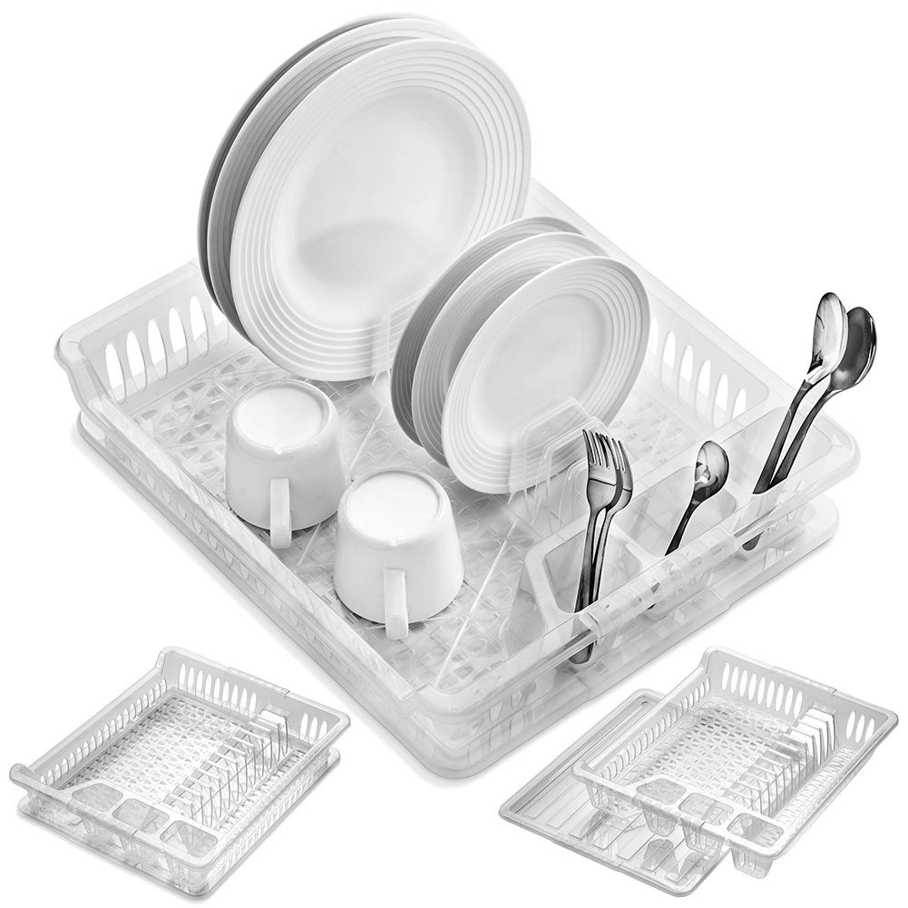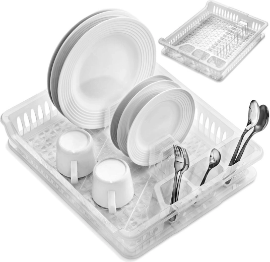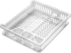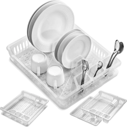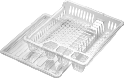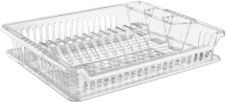 Компактен сушилник за съдове от качествен полупрозрачен пластмаса с подвижна отцедна тава. Предлага място за 12 чинии, пространство за чаши и купи и 3 отделения за прибори. Поддържа кухненския плот чист и сух, лесен за почистване е и подхожда както на модерни, така и на класически кухни.