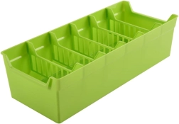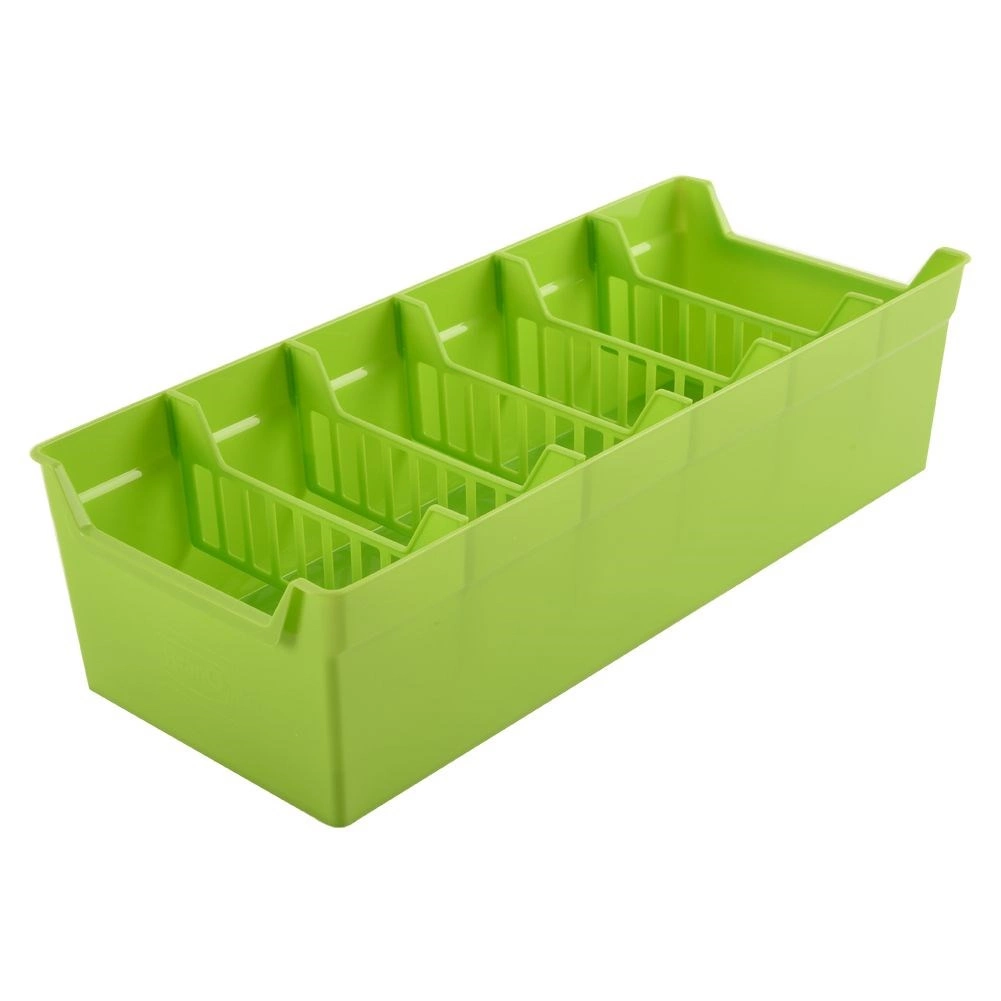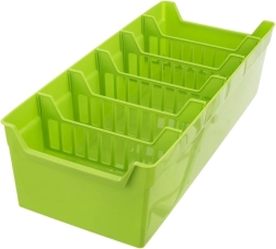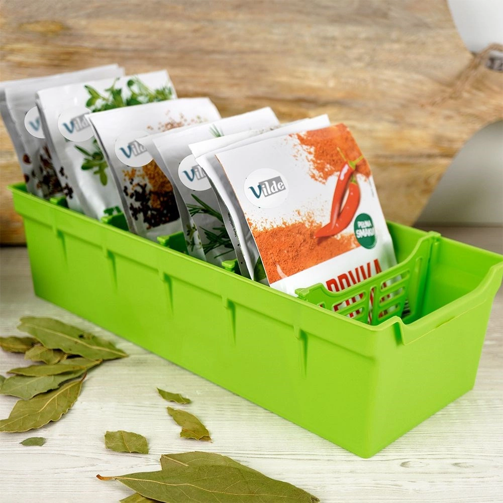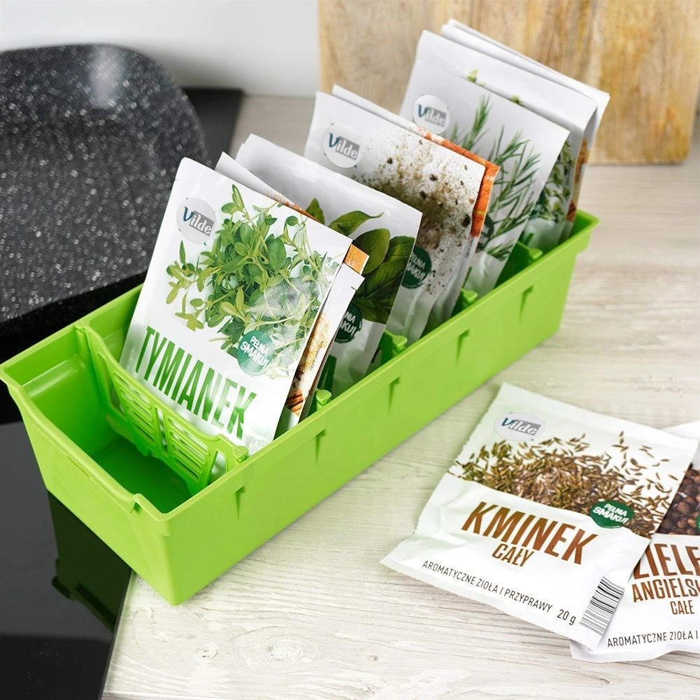 Практичен кухненски органайзер за подправки с размери 30 × 13 × 8 см, който ще ви помогне да поддържате ред в пакетчетата с подправки. Благодарение на подвижните прегради ще разделите подправките според нуждите, бързо ще намерите правилното пакетче и ще предотвратите разсипване. Лекият, но същевременно здрав пластмасов материал в зелен цвят пасва на всяка кухня.