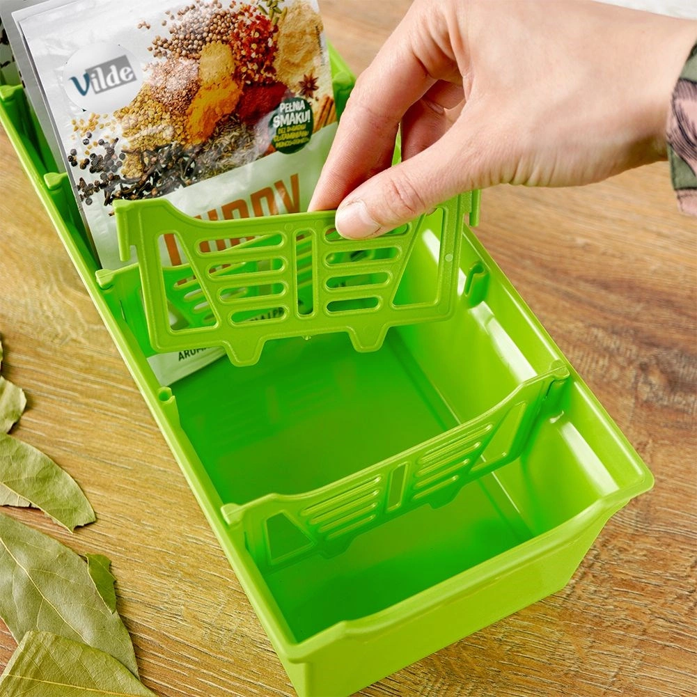 Подредете билките и подправките си ясно и елегантно. Зеленият органайзер за подправки е идеален за съхранение на пакетчета с подправки – както отворени, така и затворени. Вътре има пет подвижни прегради, които разделят кутията на шест отделения, така че получавате достатъчно пространство и добър преглед за ежедневното готвене.