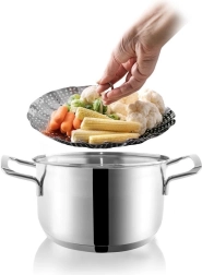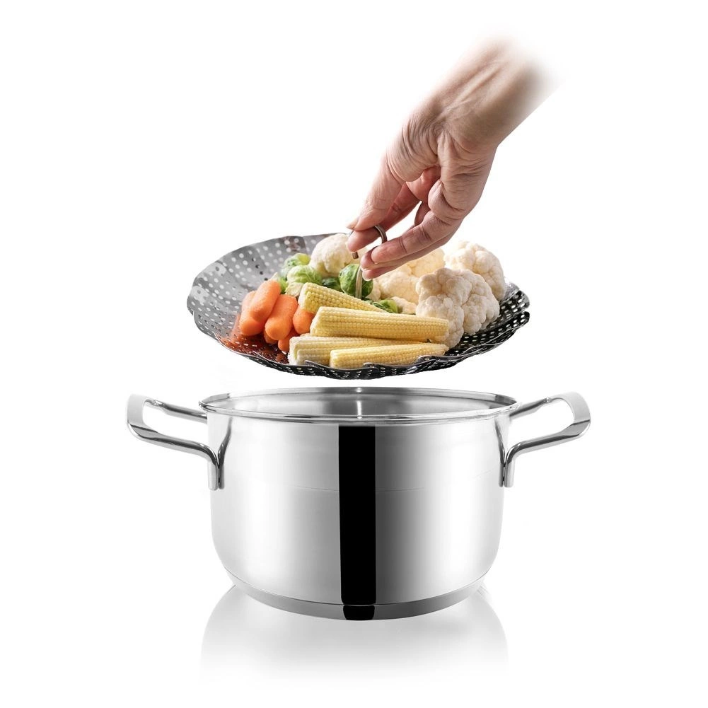 Универсален сгъваем паравен кош от неръждаема стомана с диаметър 14–23 см за здравословно готвене на пара на зеленчуци, риба, месо и кнедли. Благодарение на сгъваемата конструкция пасва в различни тенджери, лесен за почистване и подходящ за съдомиялна машина.
