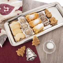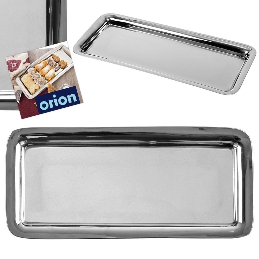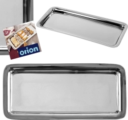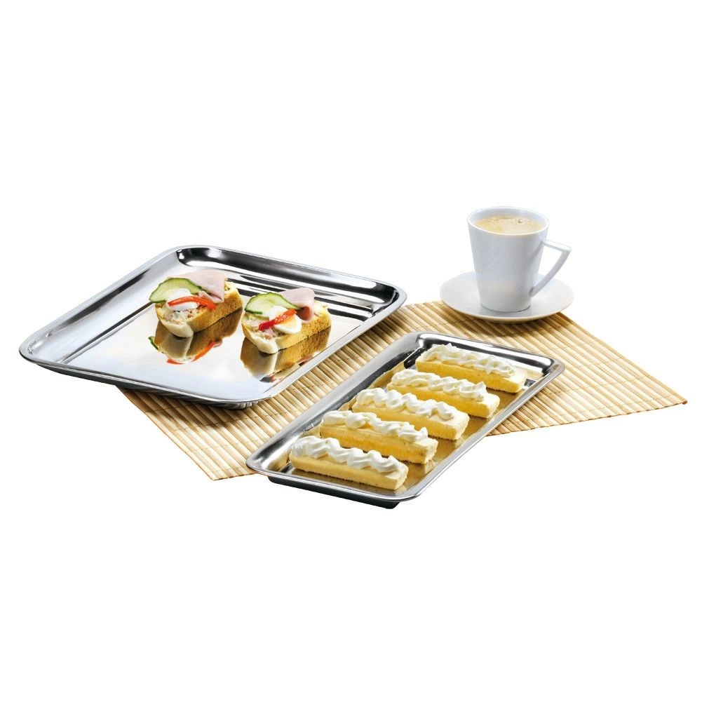 Практичен правоъгълен поднос от висококачествена неръждаема стомана в елегантно сребристо изпълнение. Перфектен за сервиране на канапета, хапки, предястия, сладки и десерти. Благодарение на повдигнатия ръб се борави удобно и храната остава сигурно на място.