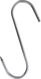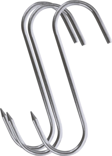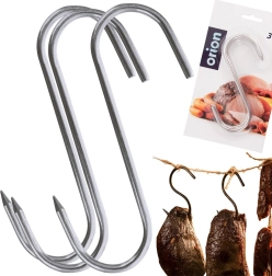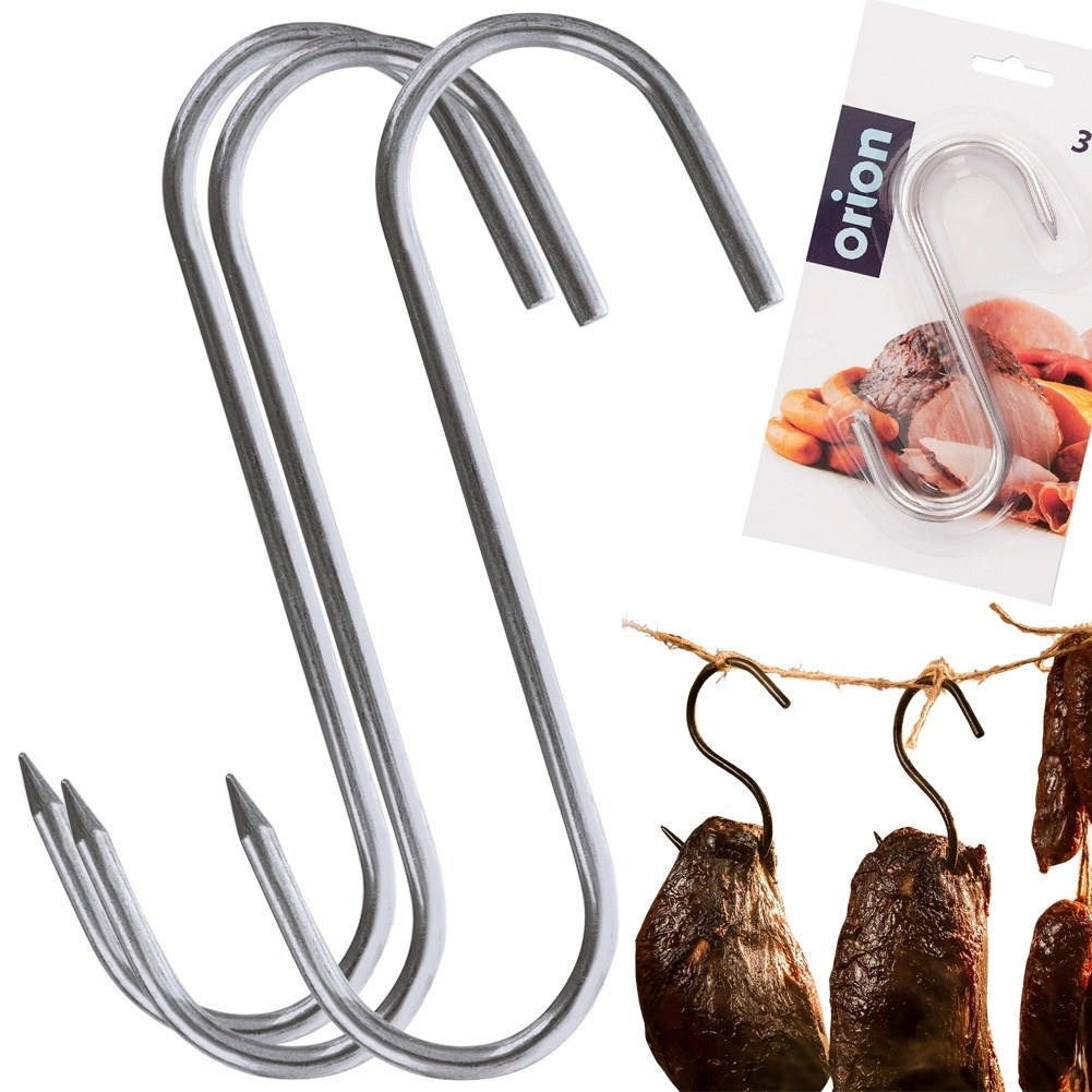 Комплект от три неръждаеми куки за пушилня с размери 13,5 × 9 см и диаметър 0,5 см е идеален за домашно и професионално опушване. Острото окончание от едната страна улеснява набождането на по-големи парчета месо, а отворената S-форма позволява бързо окачване на пръчките в пушилнята.