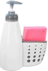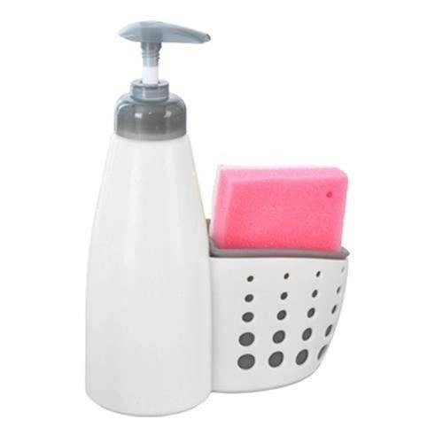 Практичен дозатор за миещ препарат или течен сапун с подвижна поставка за гъба, който ще поддържа кухнята и банята ви красиво организирани. Благодарение на обема от 370 мл лесно допълвате любимия препарат и с помощта на удобната помпичка използвате точно толкова, колкото е необходимо – без разхищение. Здраво пластмасово изпълнение в бяло-сиво, проветрива поставка за бързо изсъхване на гъбата и компактни размери 15 × 7 × 20 см правят този комплект умен аксесоар за всяка мивка и умивалник.