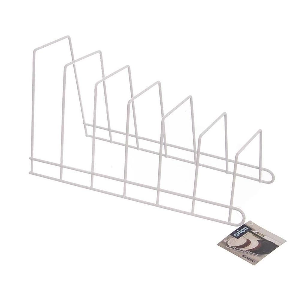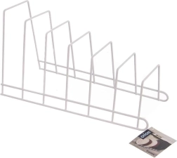 Практичен кухненски органайзер от метал за вертикално съхранение на до 6 броя – капаци, чинии или дъски за рязане. Стабилната телена конструкция в бял цвят пести място в шкафове и чекмеджета, осигурява прегледност и предпазва капаците от надраскване. Лесен за почистване и подходящ както за модерни, така и за класически кухни.