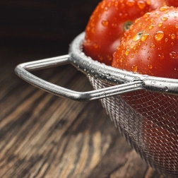 Фината неръждаема плетка надеждно задържа и малки парченца храна и едновременно осигурява бързо оттичане на водата – идеално за ориз, паста и дребни плодове.