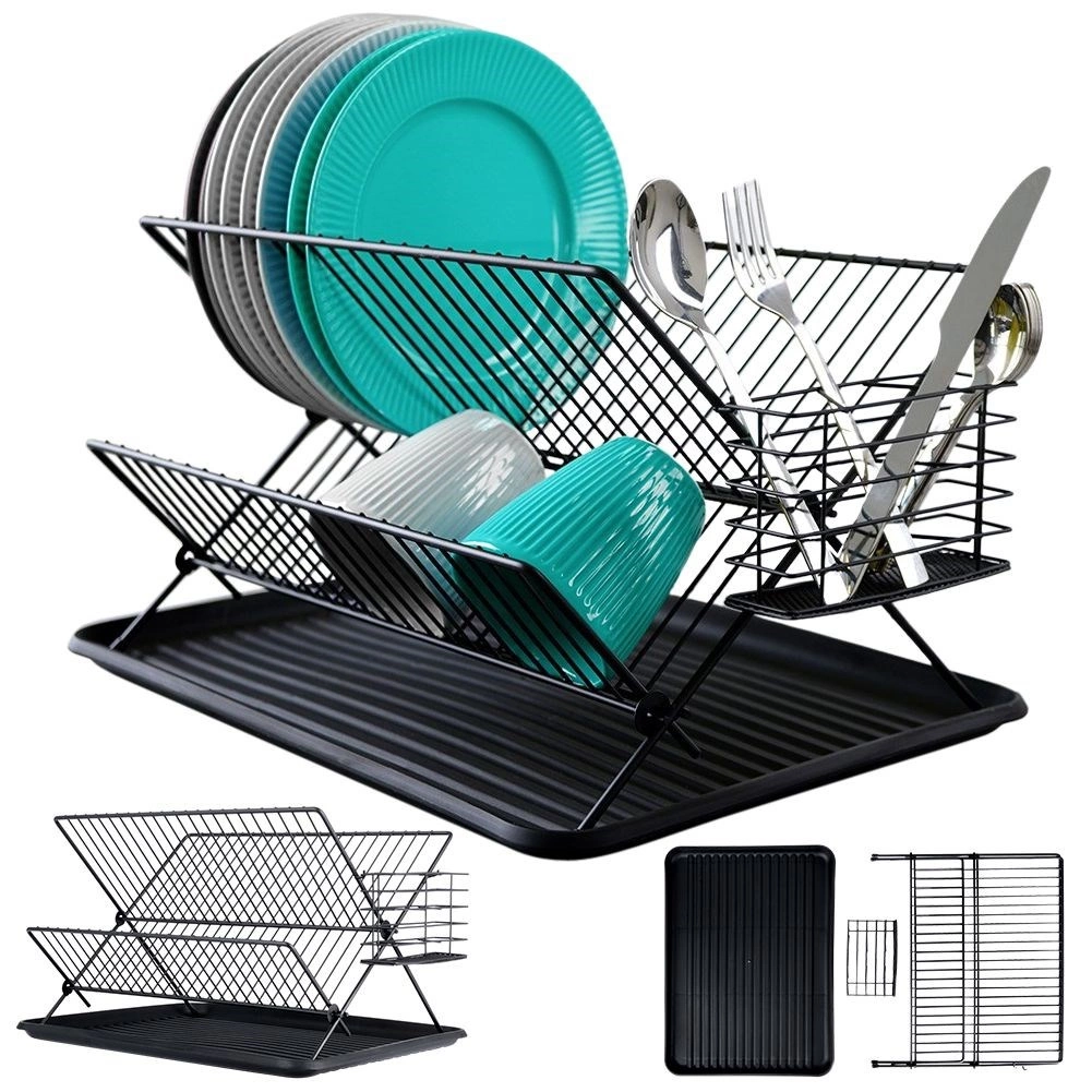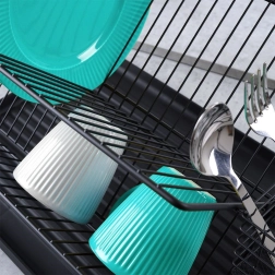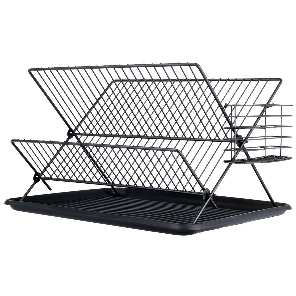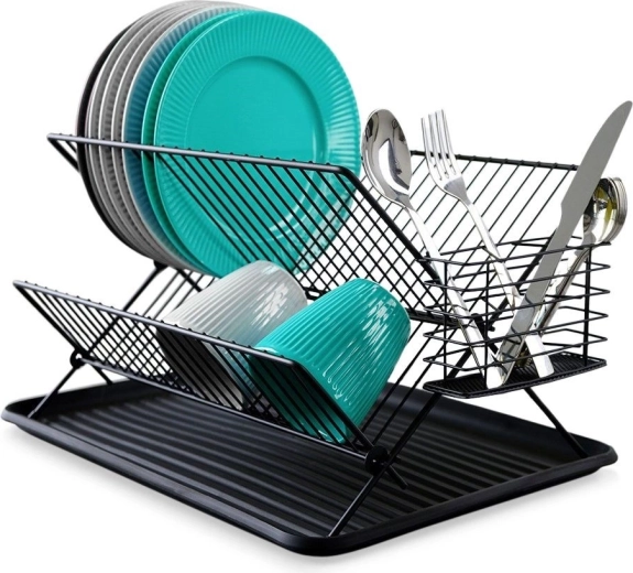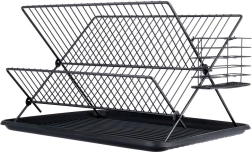 Елегантен двуетажен сушилник за съдове в черен цвят с размери 45 × 32 × 25,5 см, който подрежда и бързо изсушава чинии, купи, чаши и прибори. Благодарение на здравата метална конструкция, гумените противоплъзгащи крачета и подвижните капкови тави ще поддържа плота ви сух и чист. Модерният индустриален дизайн перфектно се вписва във всяка кухня.