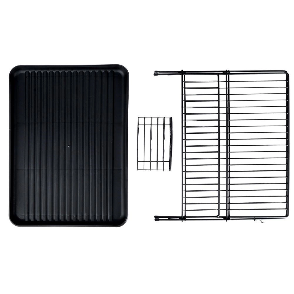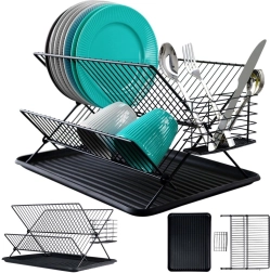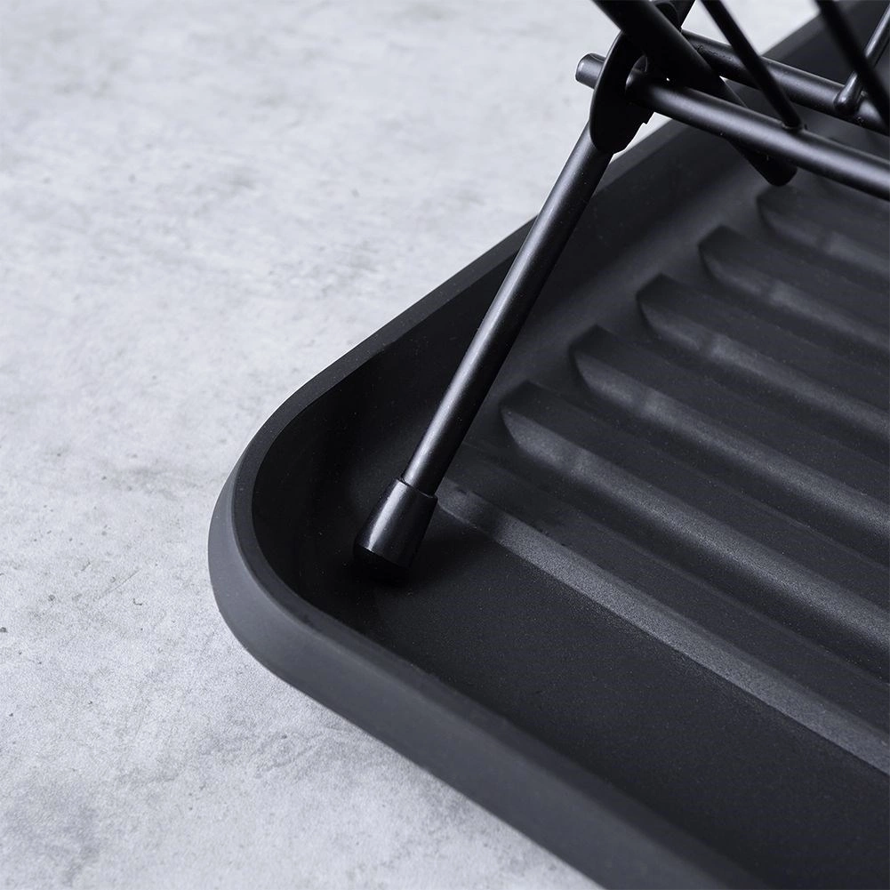 Сушилникът е изработен от здрав метал в елегантен черен цвят, има противоплъзгащи крачета за стабилност и подвижна пластмасова ваничка за лесно изливане на водата и почистване. Сгъваемата конструкция пести място, когато не ви е нужна пълната му вместимост.